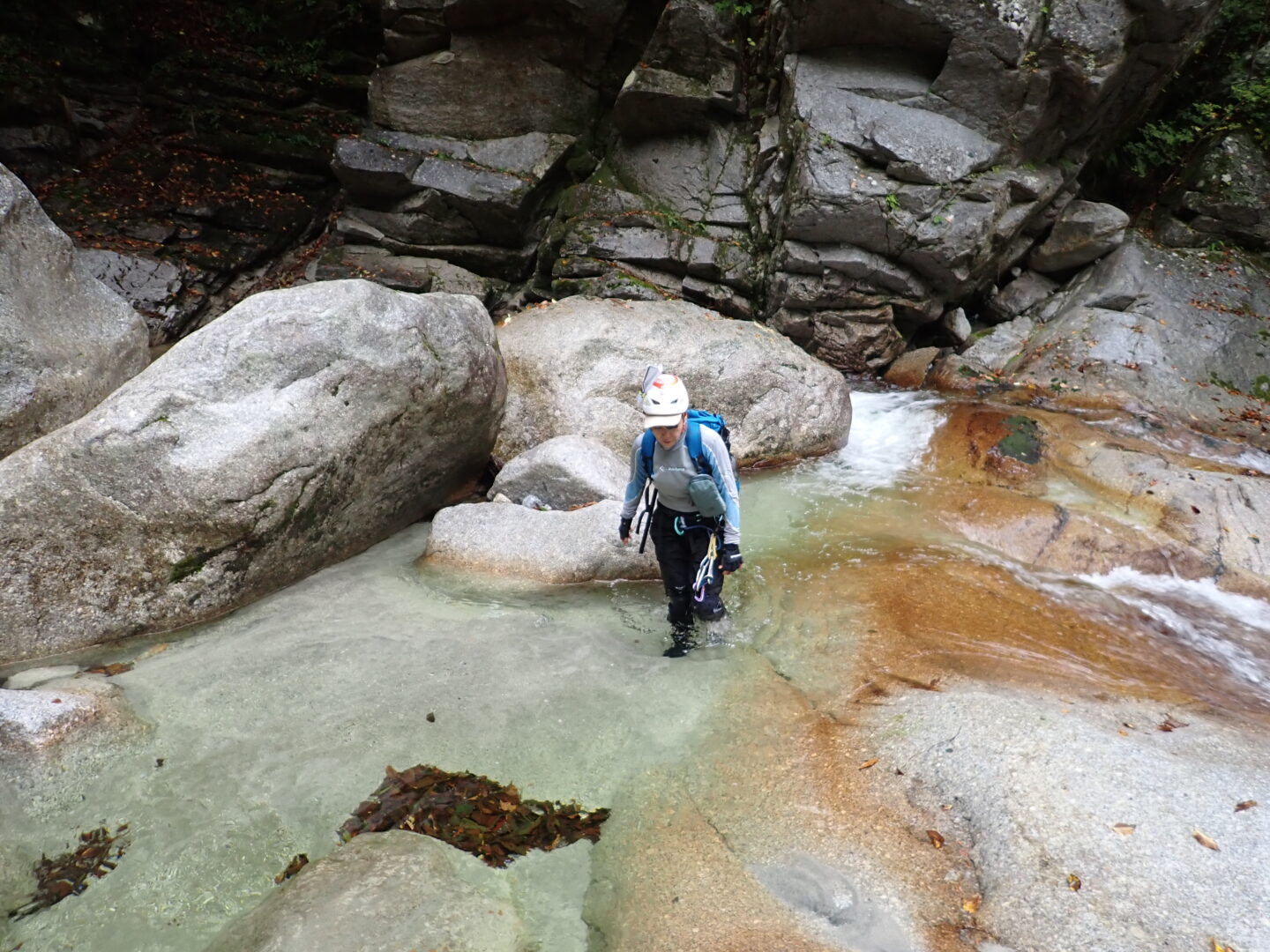 6時30分、海老名駅ターミナル。2台の車に3人ずつ分乗して出発。めざすは奥多摩湖のさらに奥となる県道411号線、丹波村山にある尾崎行雄水源踏査記念碑の駐車場。2時間40分の道のり。分乗した1台を脱渓点近くの道路わきの空き地に駐車し、戻って合流。沢装備を装着して9時50分、三条橋下から入渓。