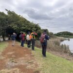 大きなアオサギが2匹、肉眼でもしっかり見えるほど大きい。お次はキアシシギ。保護色でじっくり探さないと見つからないけれど、あまりの可愛さに女性陣はメロメロ。そのまま双眼鏡を夢中で覗いていると、レンズの先に何やら白と黒の縞々模様のフワフワとした物体が…。「えええーっ!!アライグマじゃない(笑)???」。みんなびっくり。どうやらこの汽水池には外来種のアライグマが生息しているらしく、公園側も把握しているとのこと。あんなにまじまじとアライグマを見たのは初めての経験でした。