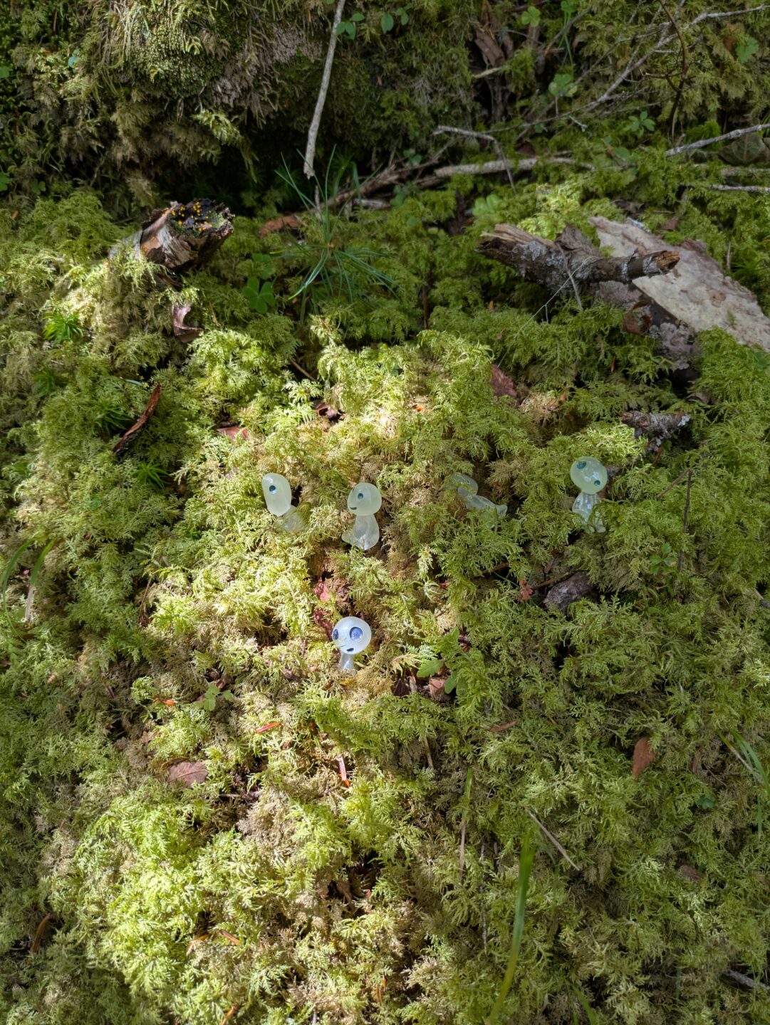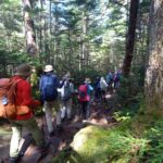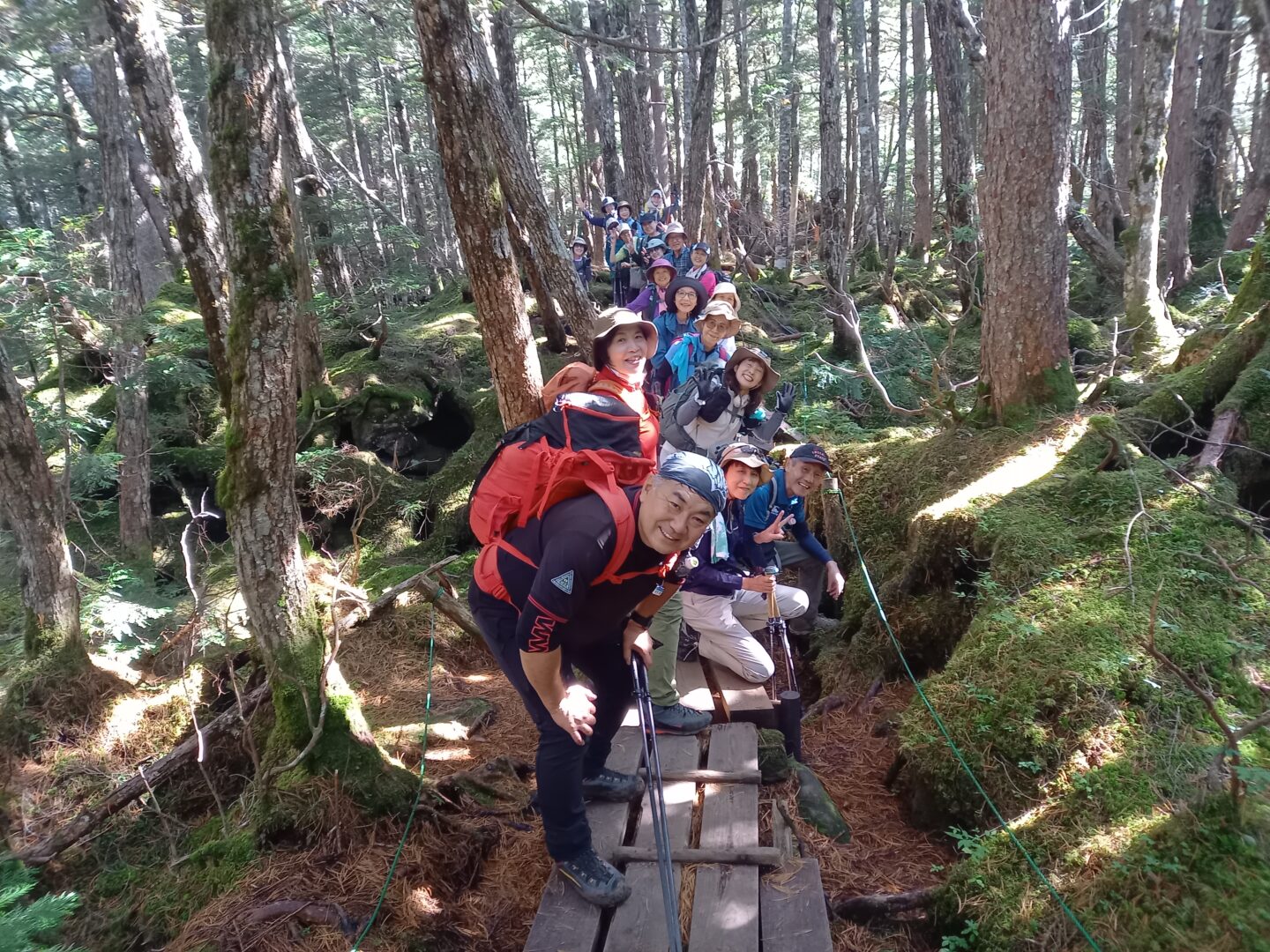 6時45分。海老名駅に20名が集合し、マイクロバスで白駒池駐車場へ。10時30分に到着しました。幸運にも天候に恵まれ、いよいよ白駒池入口より山行開始です。整備された木道を歩き始めると、そこは原生林と緑のジュータンを敷き詰めたような苔が覆い、幻想的な世界。思わず目を奪われました。リーダーからは「様々な種類の苔が生息しているので近づいて観察してみてください」とアドバイス。さらに映画「もののけ姫」に登場する「コダマ」の小さな人形を用意していただき、苔の中に置いて写真撮影を楽しみました。