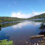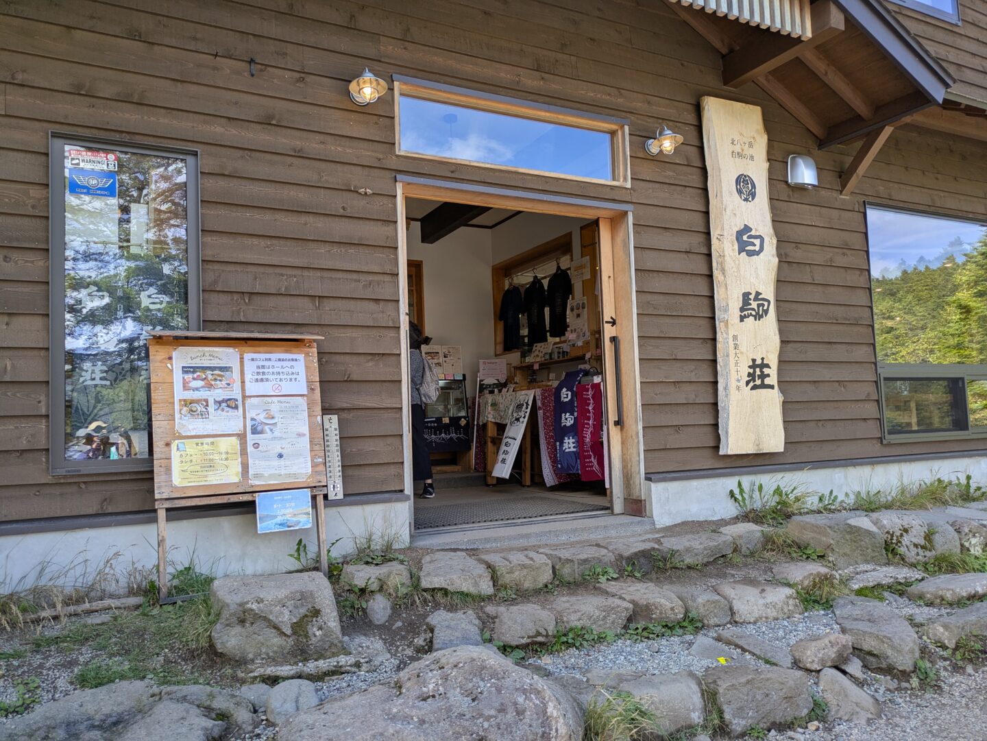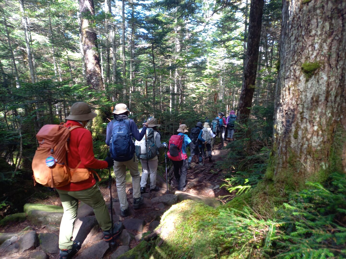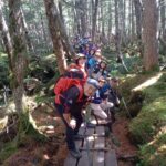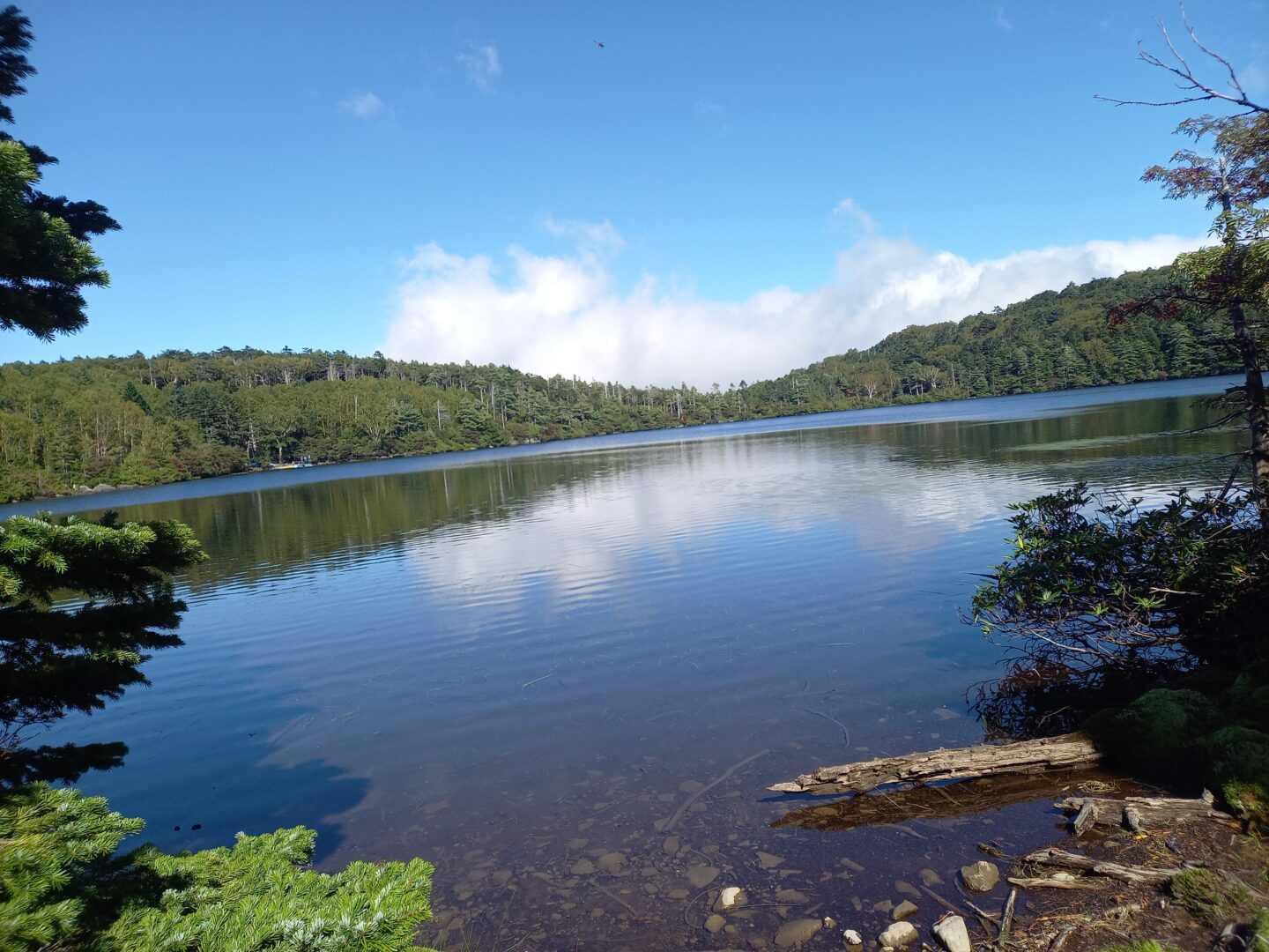 高見石小屋前で昼食休憩。晴天ながら空気が冷たく、汗をかいた身体には寒く感じられました。その後、時間の都合によりにゅう登山は諦め、白駒池周遊ハイキングへスケジュール変更。白駒池湖畔では木の立ち枯れや神秘的な苔の景色が広がり、時折、木道の下から流れる水の音が聞こえ、静かな苔の森の初めての体験に感動を覚えました。
