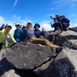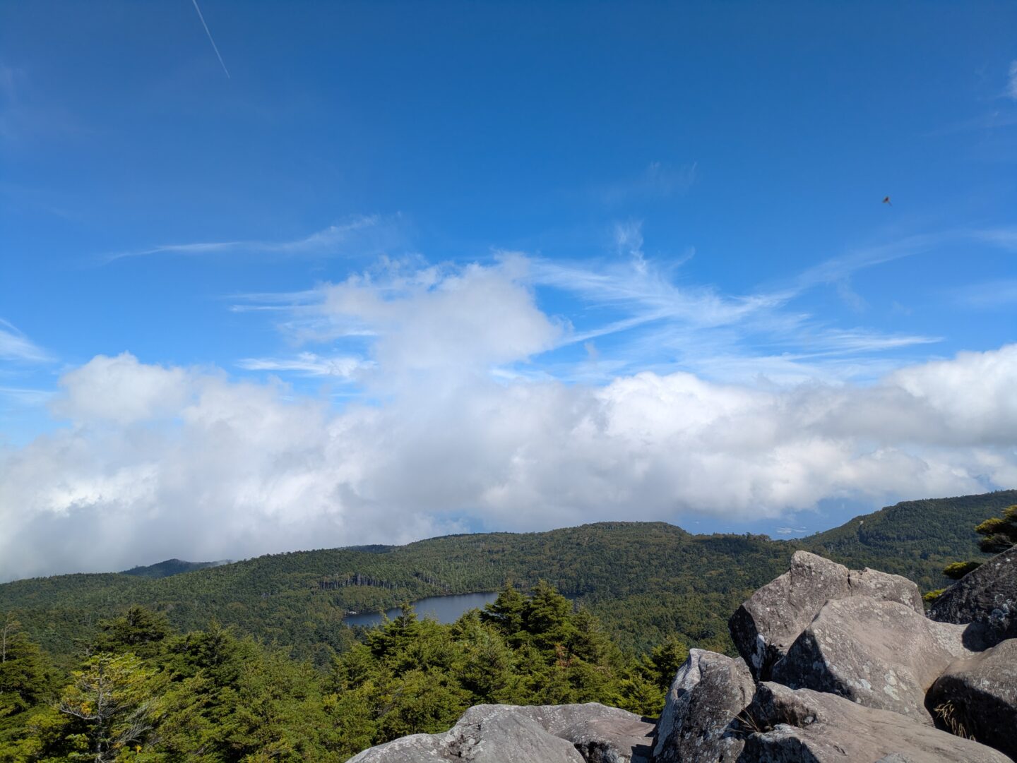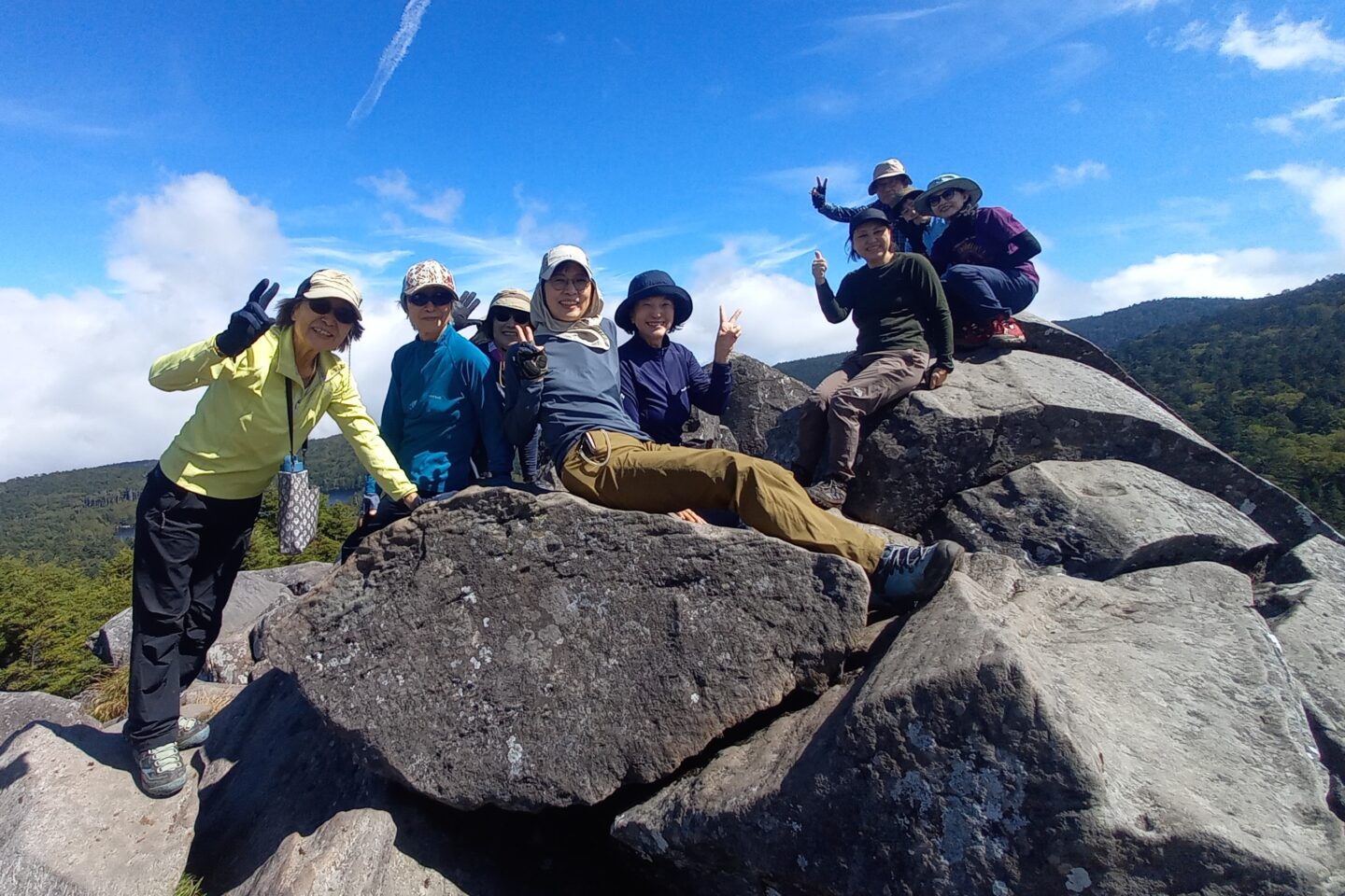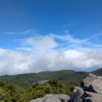 白駒荘まで進むと、白駒池が姿を現しました。青空、緑、そして真っ青な湖面のコントラストが美しく、感動しました。いよいよ登山道へ。滑りやすく岩場や木道を注意しながら進み、高見石小屋へ到着。リュックを置いて身軽になったら、小ピークである高見石(2,225m)をめざします。岩場が危険なため、リーダーのサポートを受けながら無事登頂!眼下には白駒池、八ヶ岳。360°のパノラマが広がり、思わず歓声を上げました。