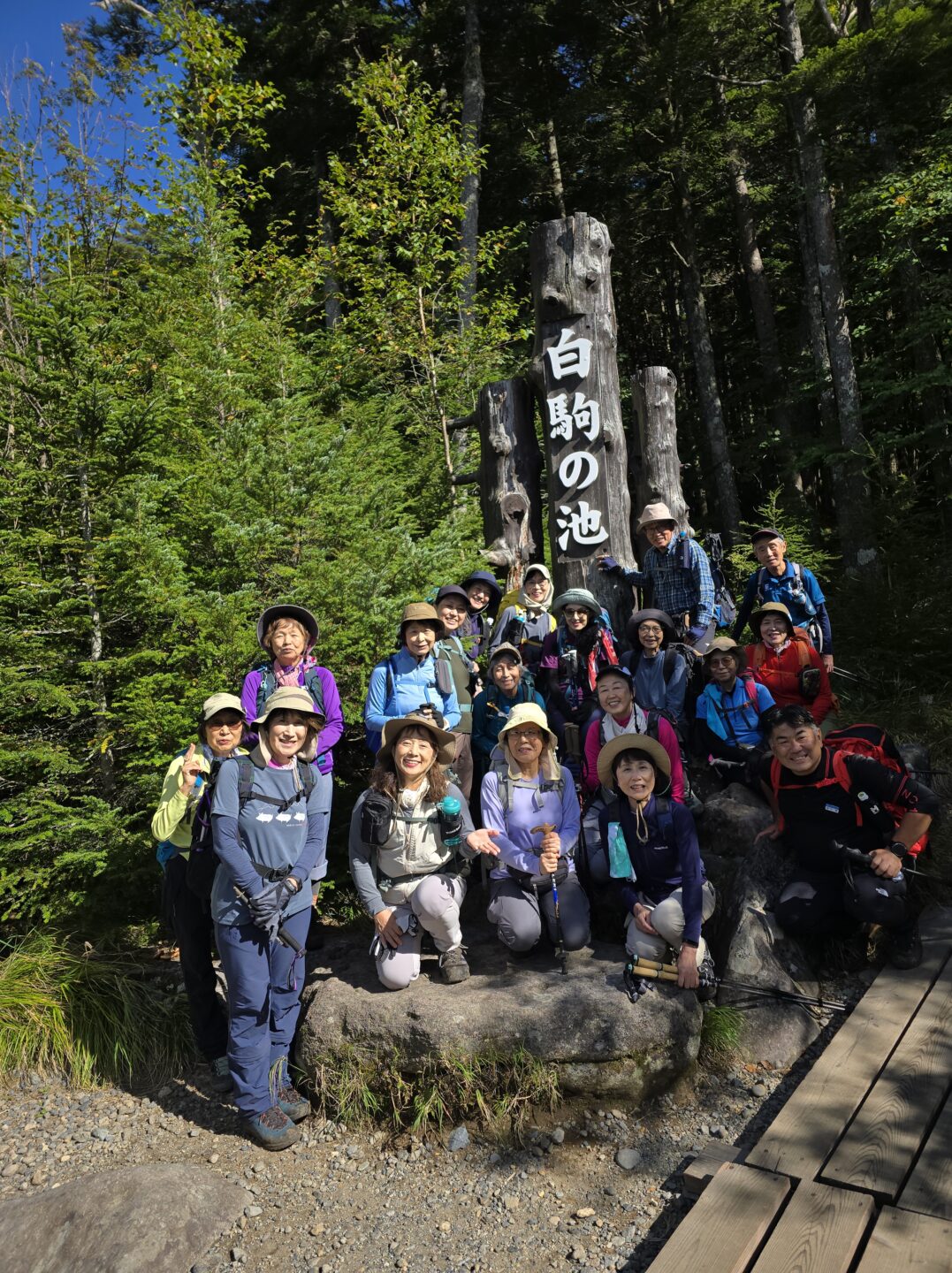 14時10分、白駒池入口に到着し、全員で記念撮影をし帰路へ。途中、たてしな自由農園などに立ち寄り、休憩を取りながら18時30分に海老名駅に到着、解散となりました。