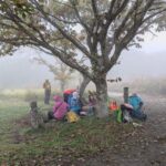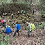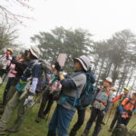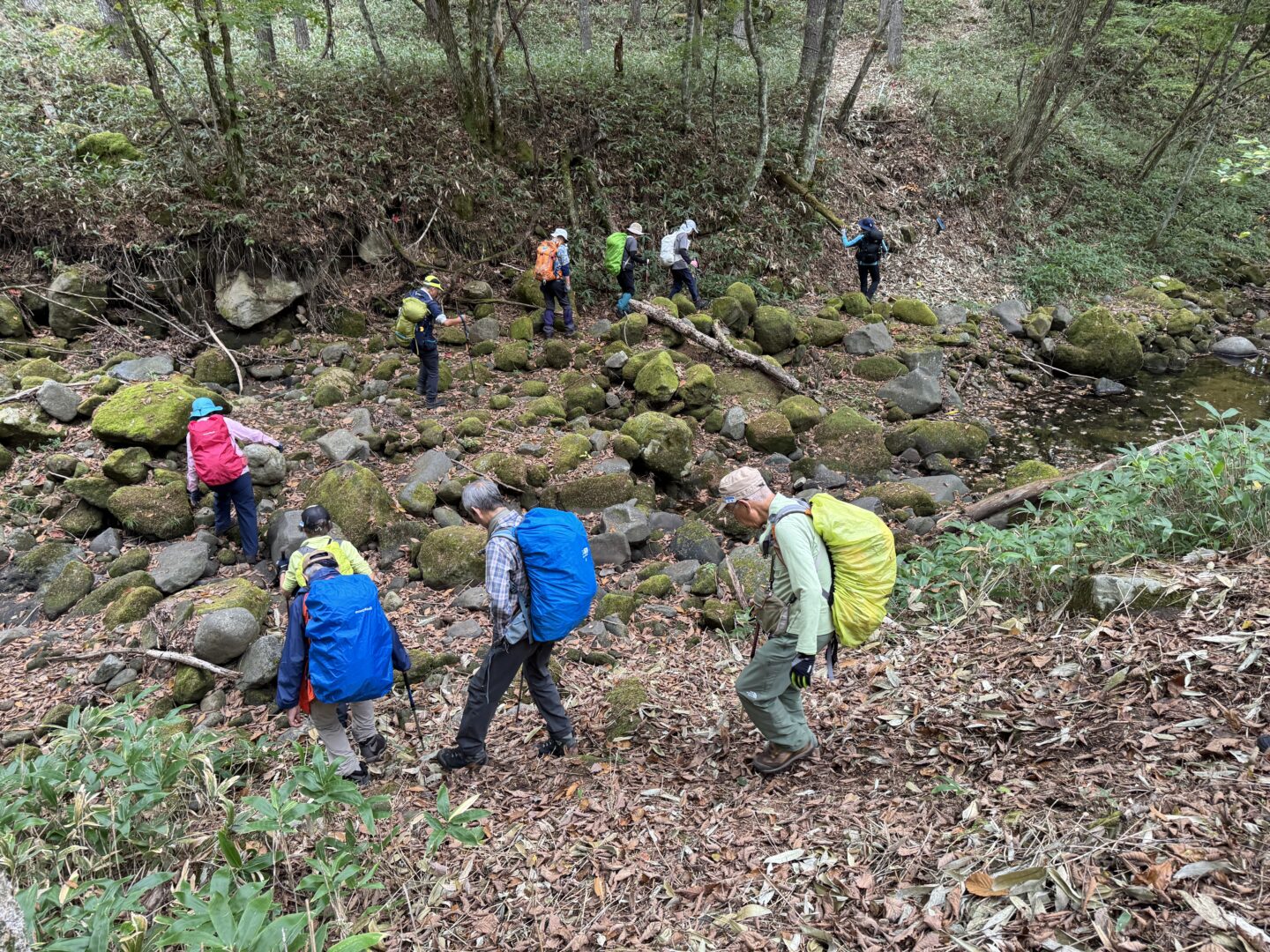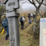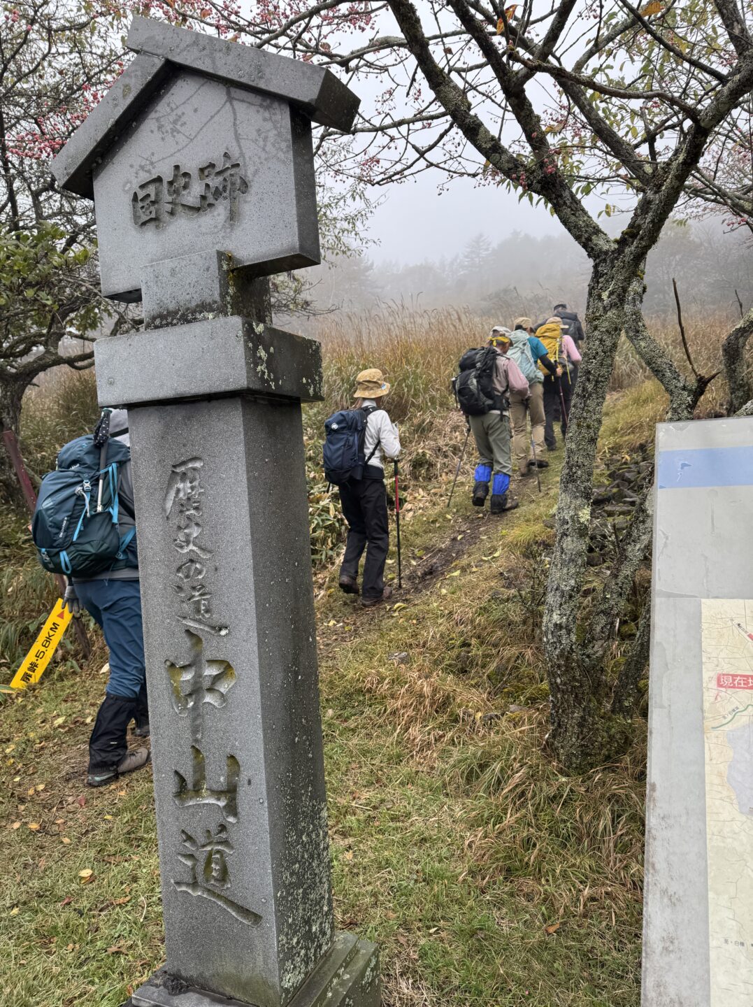 初日は約10キロ。10時15分に長門牧場を出発、霧につつまれた林道を歩きます。1時間ほどで牛首に到着。江戸時代に作られた水源管理の遺跡とのこと、今は何もありません。