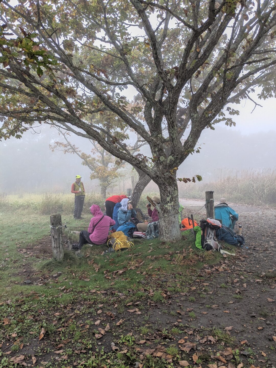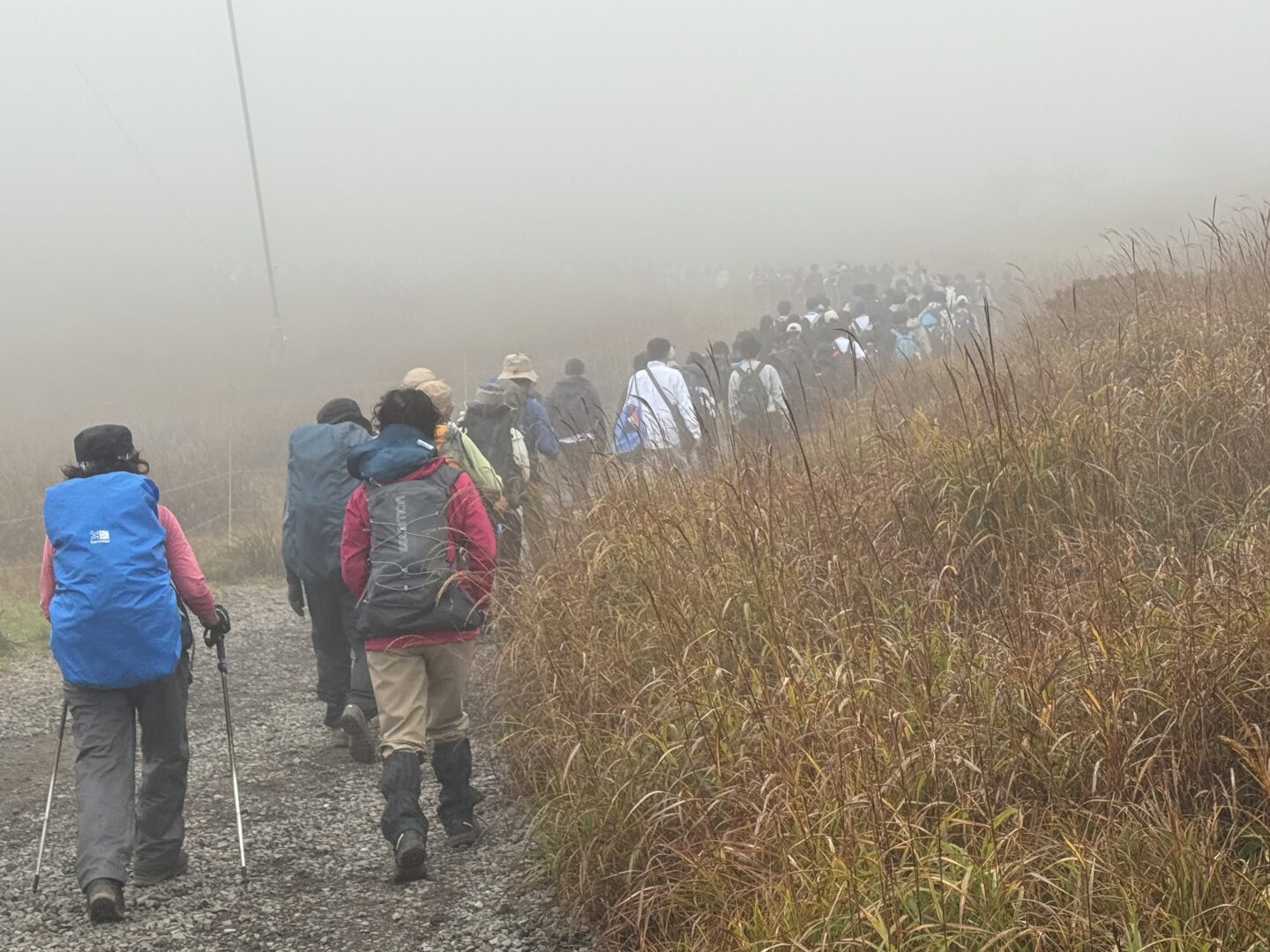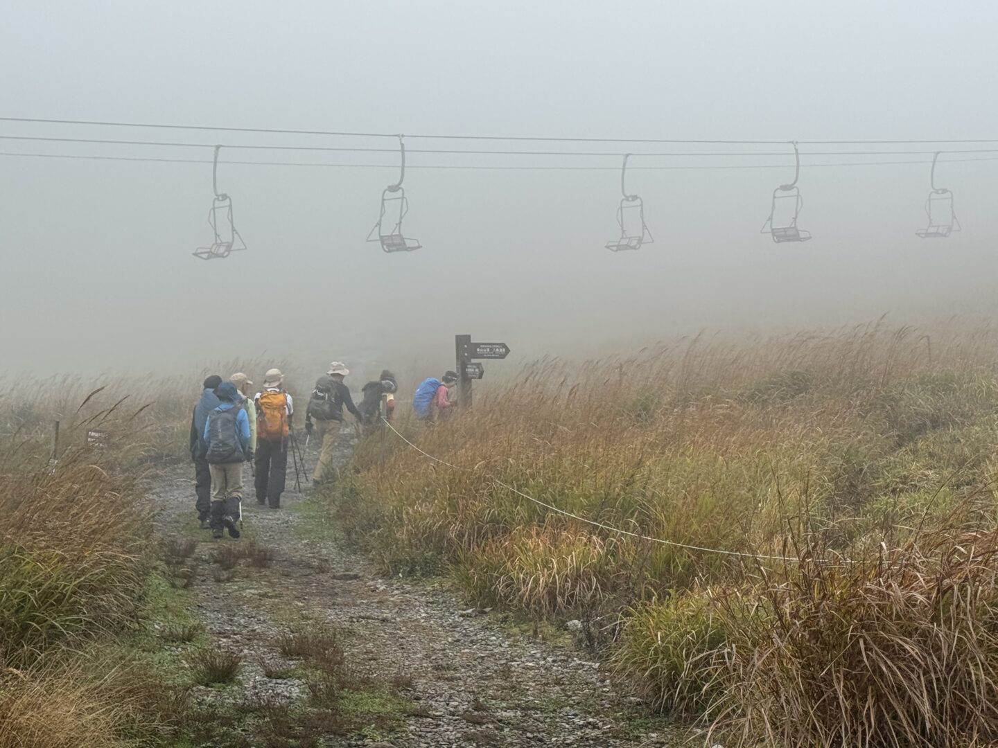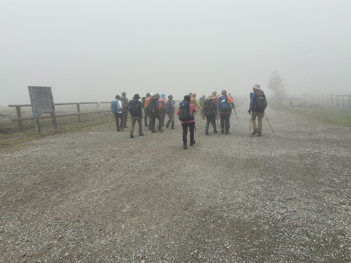 鷲ヶ峰から1時間ほど下り、今日の到達点である和田峠に着きました。9月は体調が悪く歩いていない中での参加でしたので歩けるか不安がありましたが、何とか今日の行程を歩くことができ、ホットしました。霧雨の霧ヶ峰を歩いていると幻想的で、夢の中をさ迷っている感覚に捕らわれることがあり、不思議な心地がしましたが、次回は美しい雄大な景色を堪能できることを期待したいです。(文責:4112)