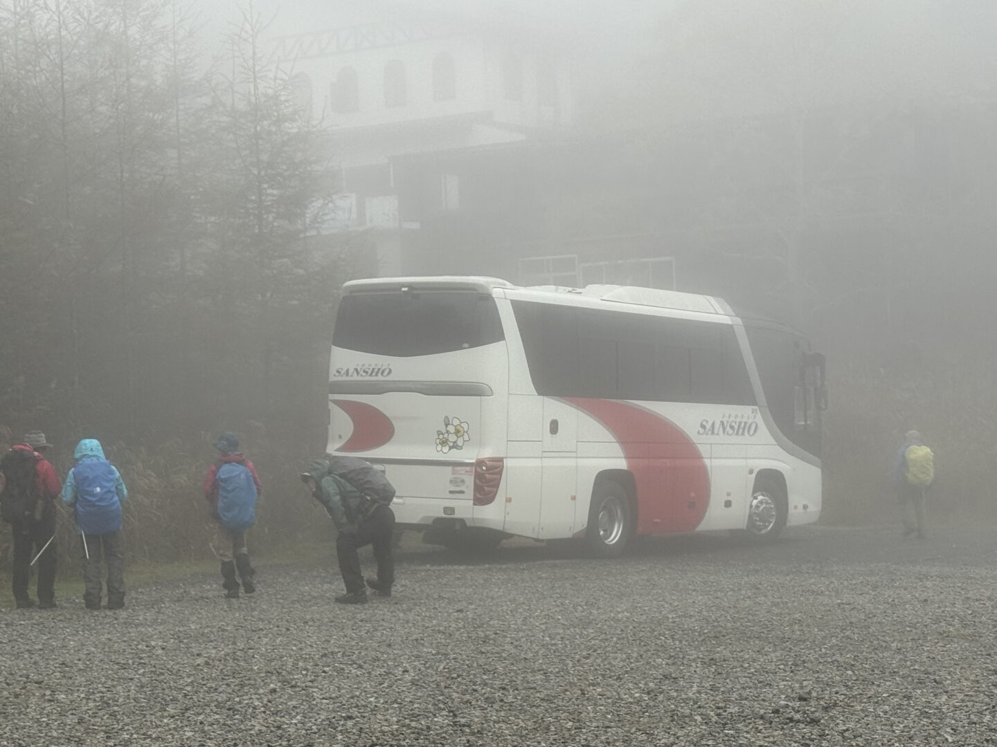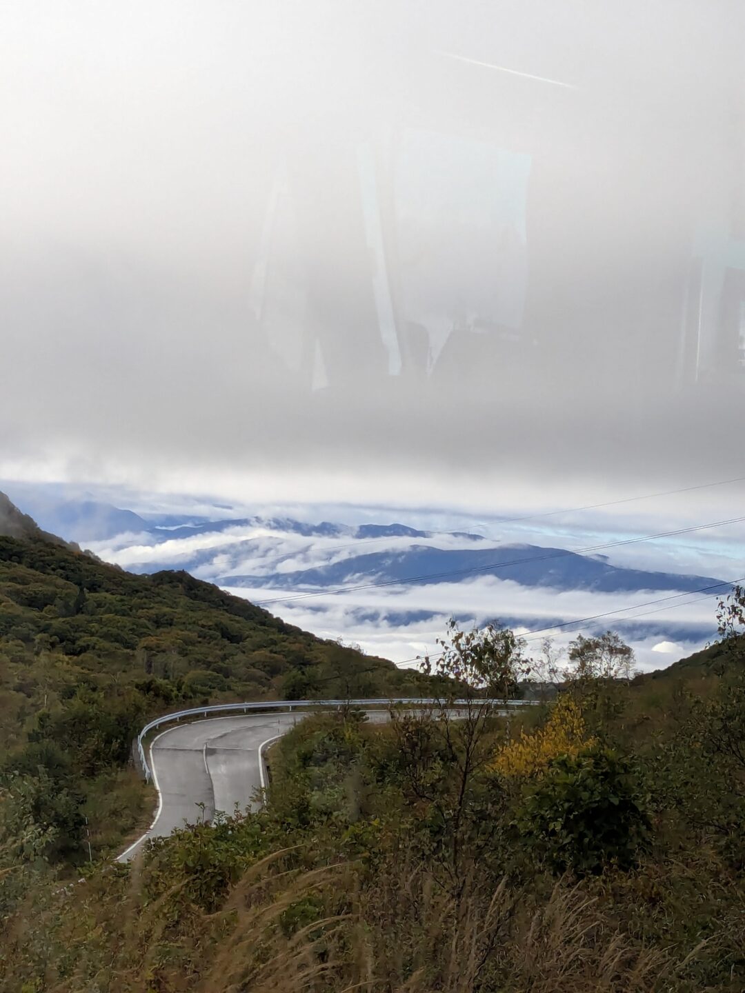 3日目は幸運にも昨夜の雨が明け方に止んだ。ホテルを7時40分ごろにバスで出発した。今日のスタート地点の旧和田峠駐車場(1,531m)まで雲海を左手に見ながら向かった。