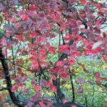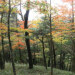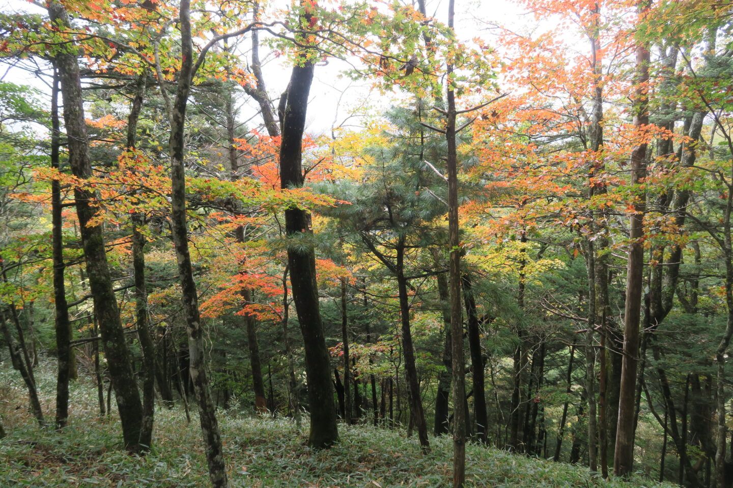 進むにしたがって霧が濃くなり、風も出てきた。三峰山頂(1,887m)では霧のため、視界はなかった。三峰山を下り始めると、一転して風もおさまり暖かくなる。途中でこの山行で初めての紅葉に出会えた。