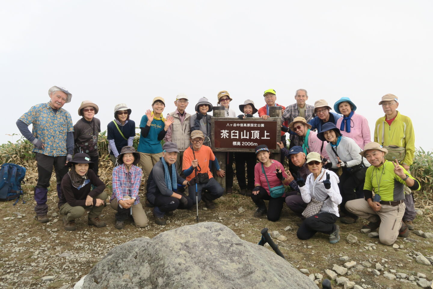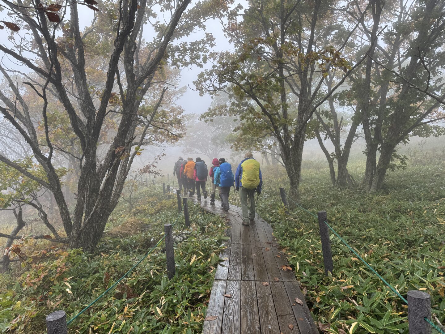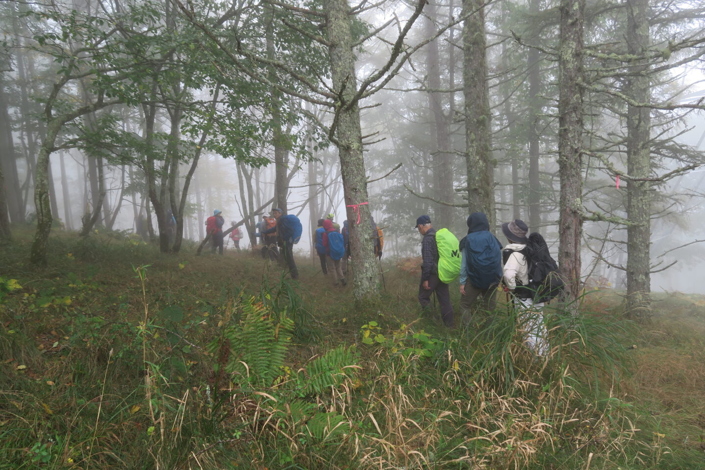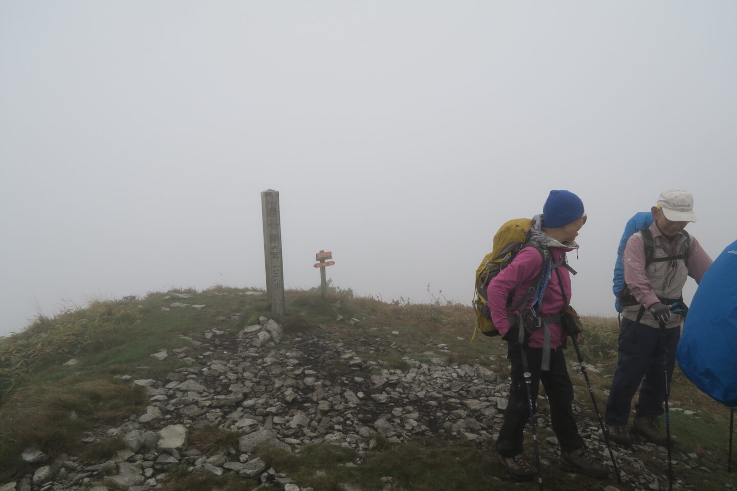 扉峠(1,660m)で昼食後、茶臼山に向かう。急登からスタートし、なだらかな道を過ぎ、再度登りが始まったところで霧が晴れ、山頂が見えた。「あそこが山頂だ、あと少しだ」との声が聞こえ、本日の最高峰・茶臼山(2,006m)にたどり着いた。