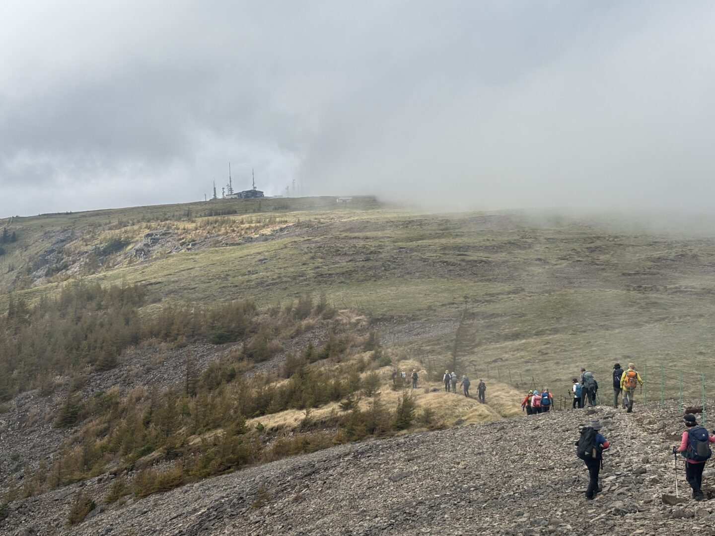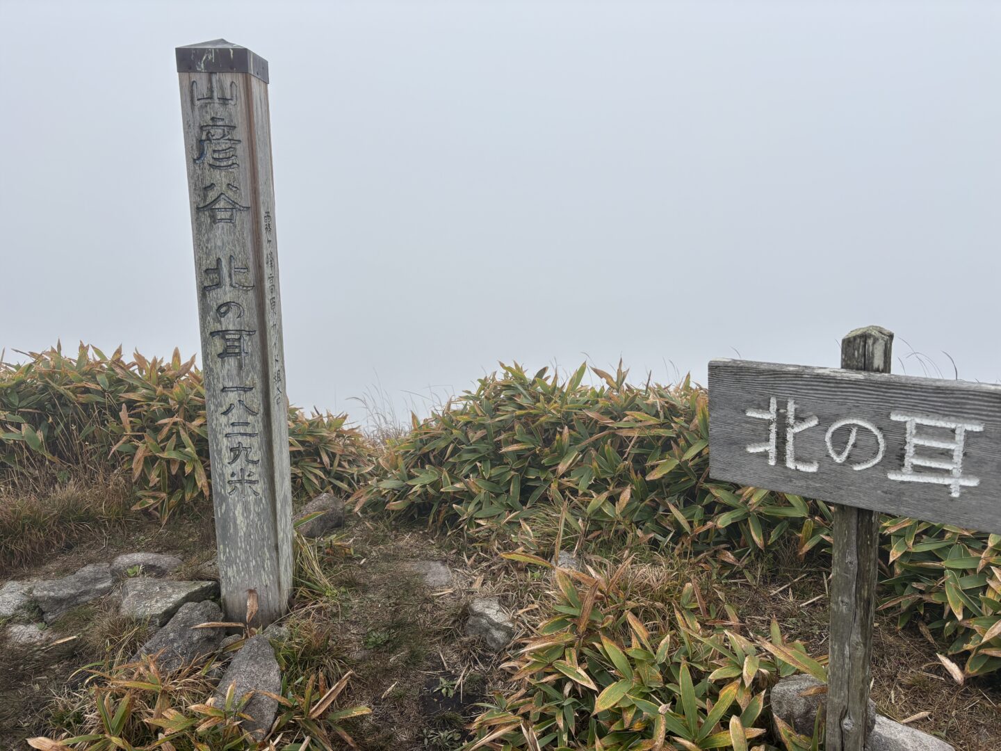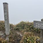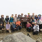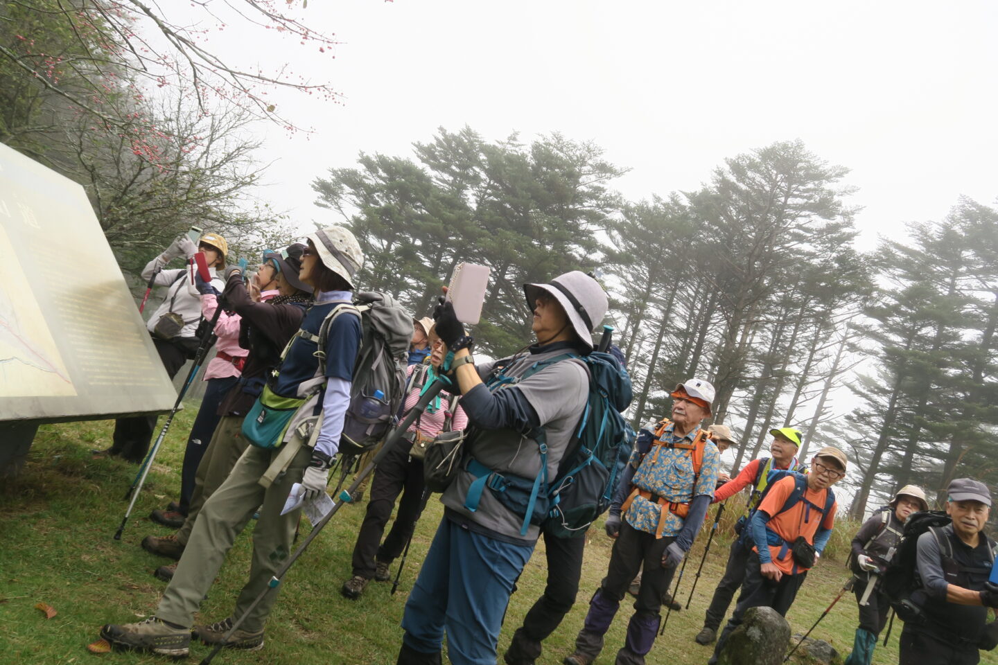 扉峠(1,660m)で昼食後、茶臼山に向かう。急登からスタートし、なだらかな道を過ぎ、再度登りが始まったところで霧が晴れ、山頂が見えた。「あそこが山頂だ、あと少しだ」との声が聞こえ、本日の最高峰・茶臼山(2,006m)にたどり着いた。