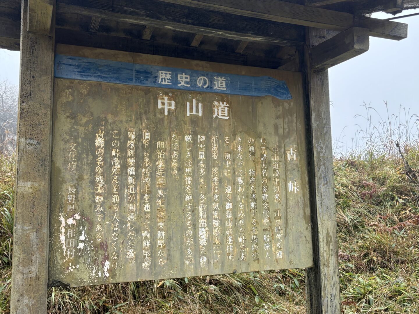 和田峠まで進むと、予定のルートに踏み跡がない。しかたなく駐車場まで戻り、迂回して旧和田峠まで進んだ。旧和田峠は中山道の重要地点であったこともあり説明板も多く、「中央分水嶺トレイル」の標識も膝の高さぐらいに設置されわかりやすい。クマザサの道を三峰山に進んだ。