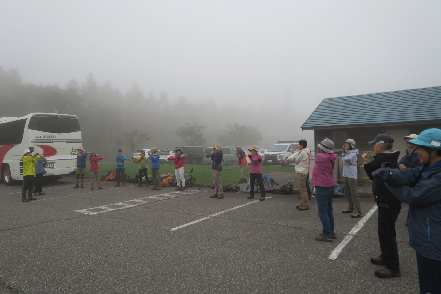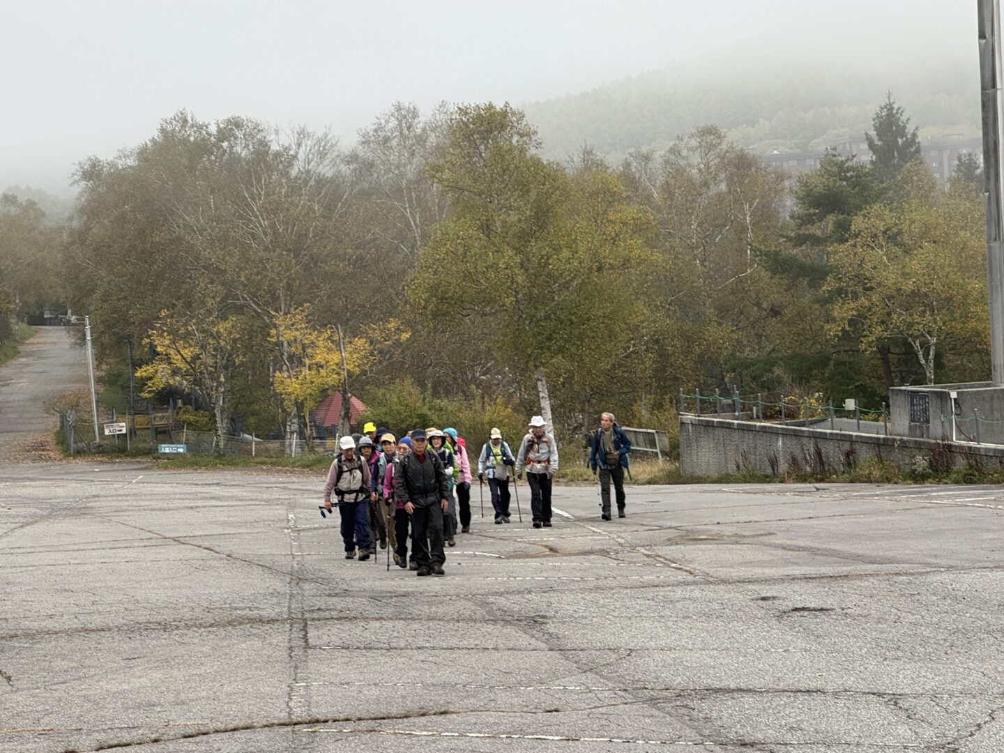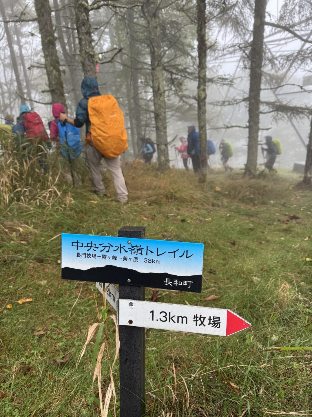 美ヶ原牧場では遊歩道を歩くが、塩くれ場・美しの塔は濃霧のため見えず。山本小屋(2,000m)に15時35分過ぎに到着。SLの整理体操・CLの締めの言葉でトレイル終了。3日間で約38㎞歩いた満足感を味わいながら、帰路についた。(文責:4154)
