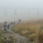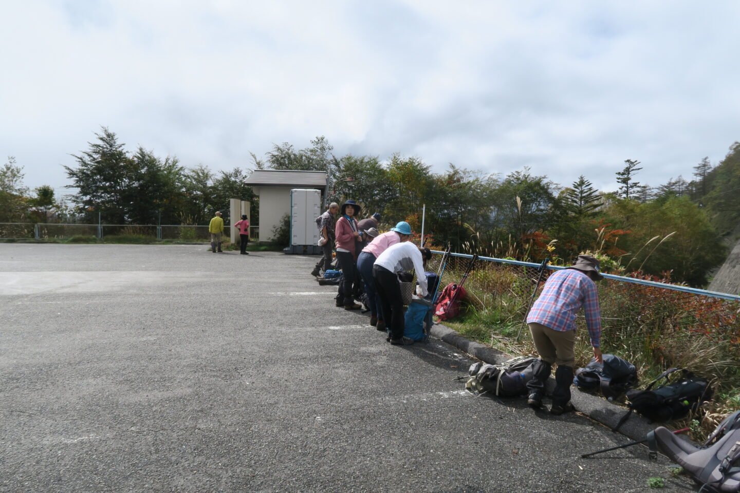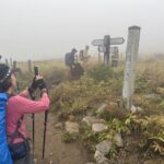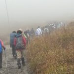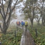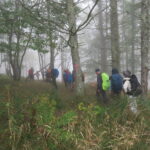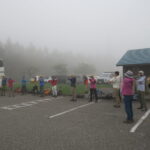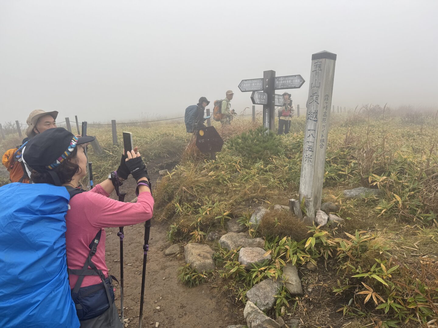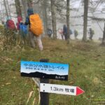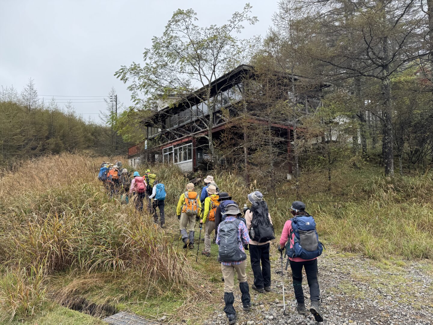 美ヶ原牧場では遊歩道を歩くが、塩くれ場・美しの塔は濃霧のため見えず。山本小屋(2,000m)に15時35分過ぎに到着。SLの整理体操・CLの締めの言葉でトレイル終了。3日間で約38㎞歩いた満足感を味わいながら、帰路についた。(文責:4154)