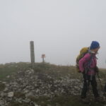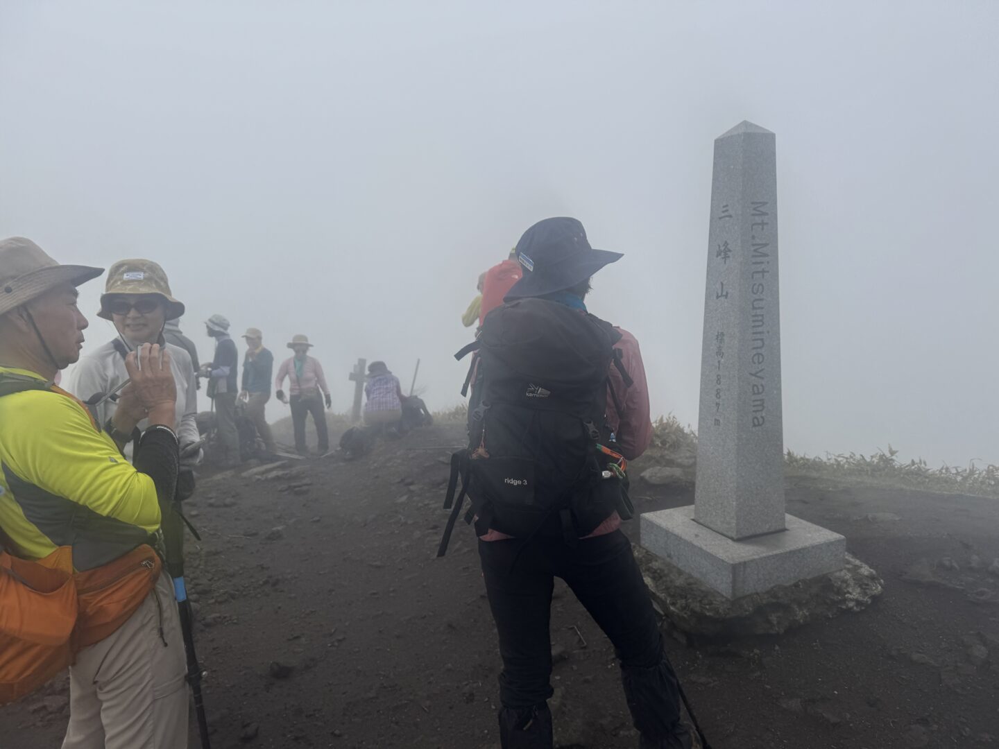 霧の八島湿原の木道を歩きながら、2年前の6月、快晴の霧ヶ峰から八島湿原を歩いたことを思い出しました。八島が池から鷲ヶ峰に辿り着いたころには霧雨が強くなっていましたが、道標の前で写真を撮りあいました。