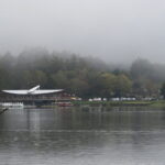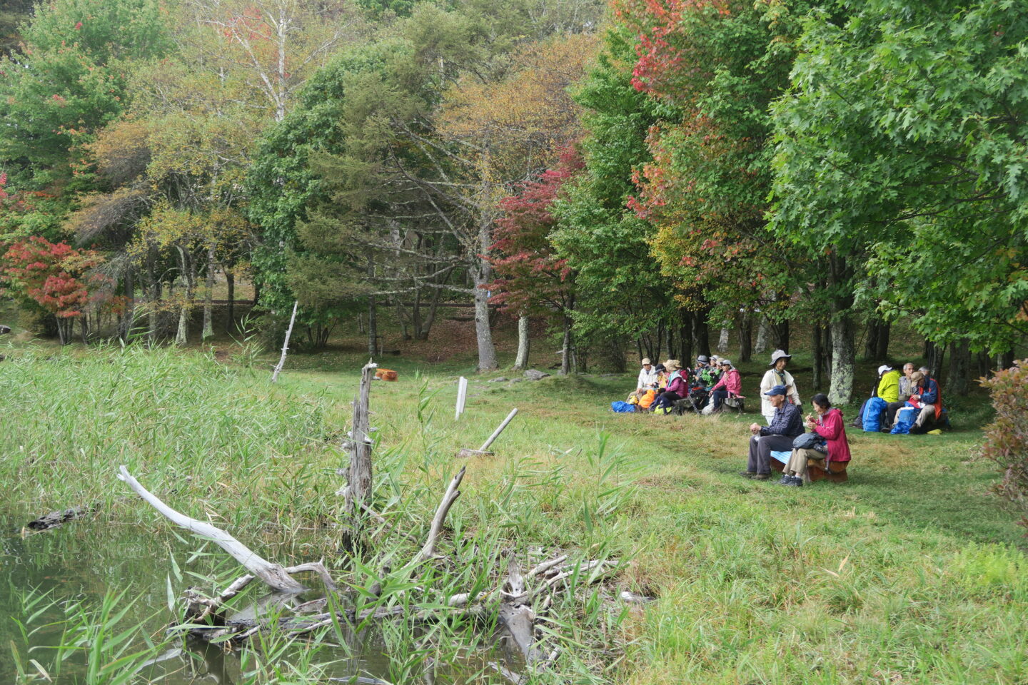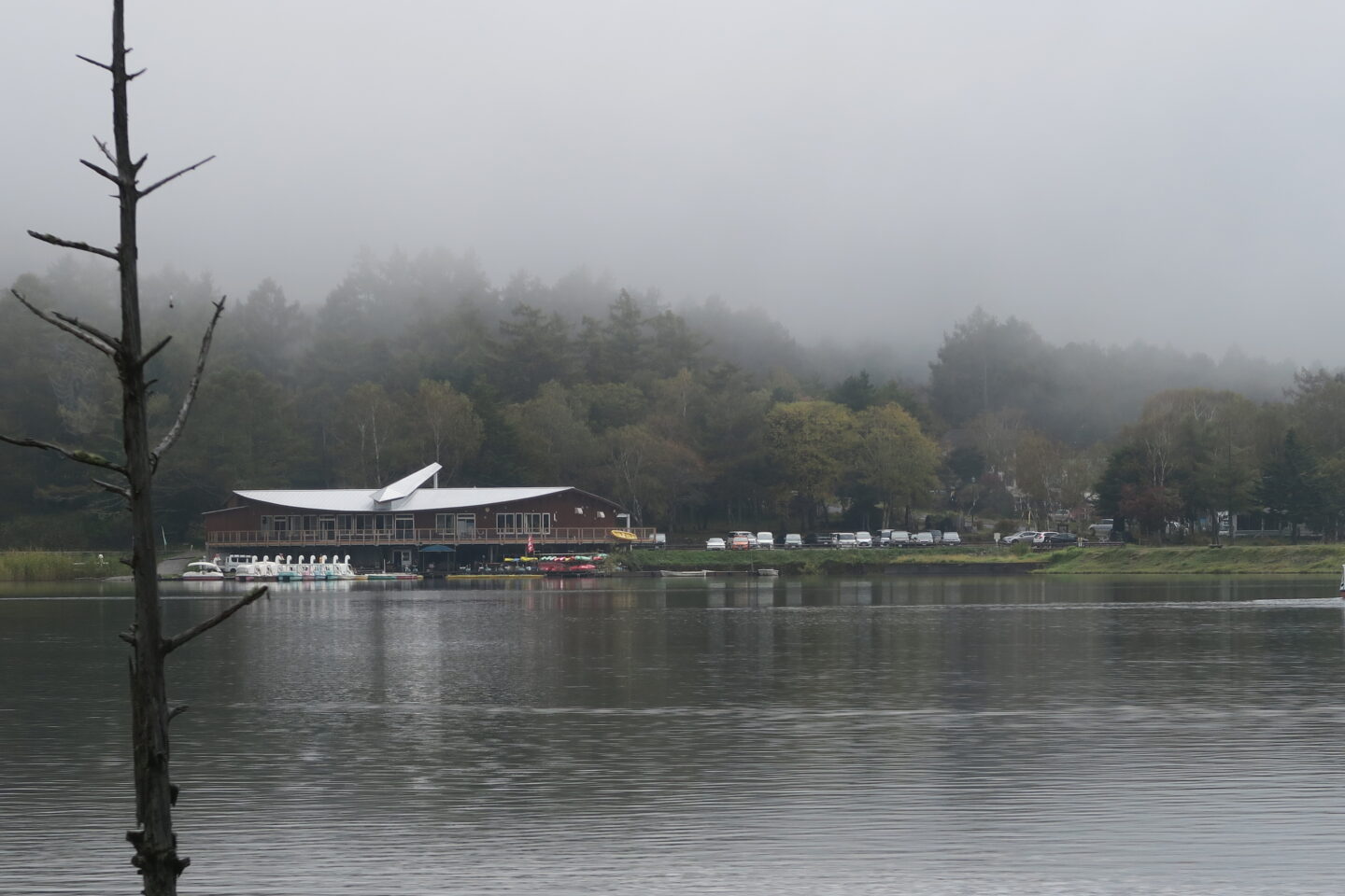 クマザサが生い茂る道を進み、舗装道路が見えたら霧につつまれた女神湖に到着。神秘的!ベンチもあり、ここでゆっくり昼食。時間と共に霧が晴れ対岸が見えてくると、湖岸の所々に美しい紅葉が!観光施設の建物も見えリゾート感たっぷり。