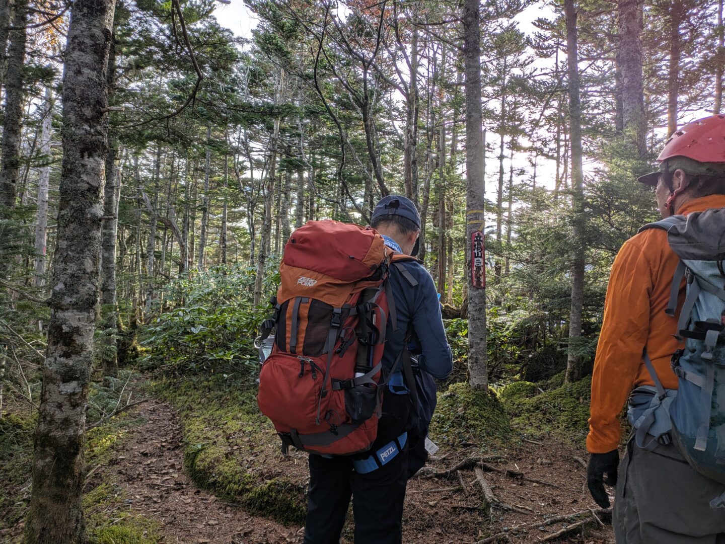 舟山十字路から暗闇の中、出発。間もなく夜が明け、鮮やかな朝焼けを見ながらの林道歩きは、徐々に緊張をほぐしてくれた。
