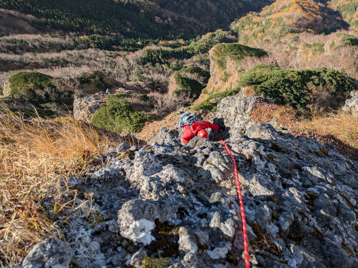 上から声がかかりいよいよ自分の番だ。もう登るしかない。緊張と寒さから手がかじかんで、感覚がなくなる。登りに気を取られ、途中のヌンチャクにアッセンダーが引っ掛かり登れなくなる。一度下がってヌンチャクを外した。何故かヌンチャクを外したところから緊張がほぐれ、周りがよく見えるようになった。麓の紅葉が美しい。