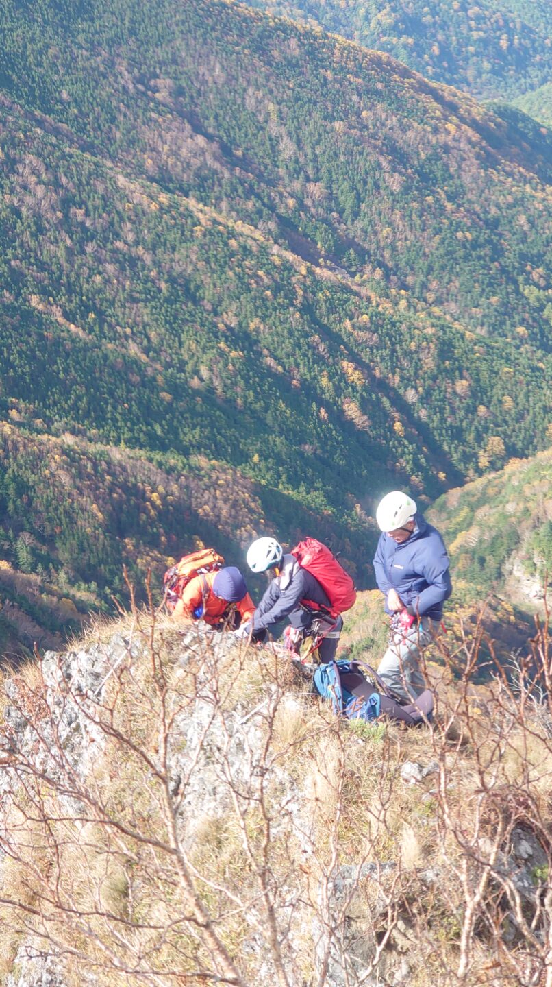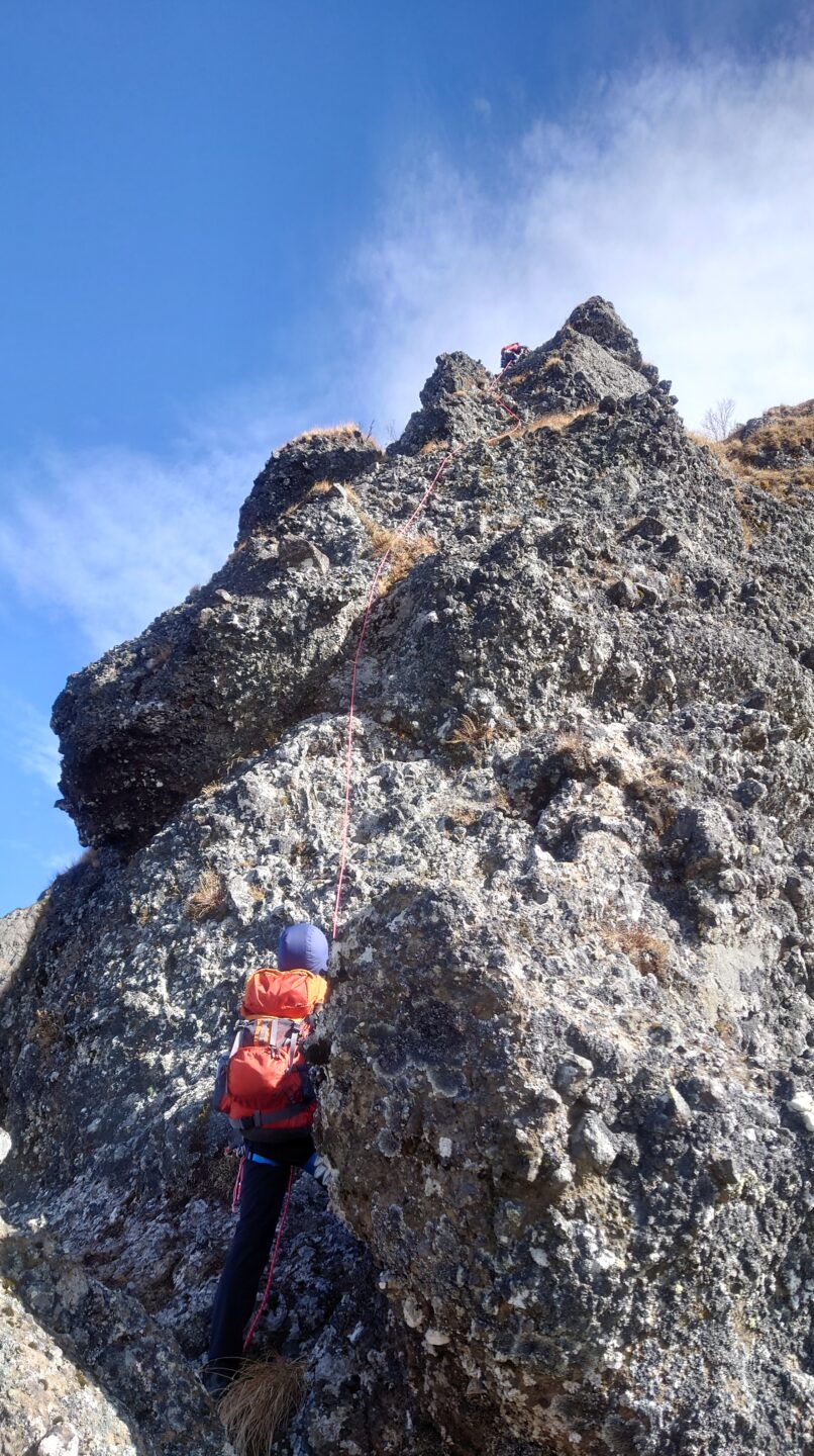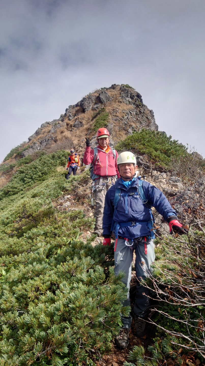核心部は短い岩峰登りだったが、高度感を感じながら登る緊張感と達成感、チームで登る一体感を経験できた特別な山行となった。 (文責:4063)