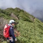 いくつかの岩峰を巻き、次の岩峰に差し掛かったところでCLがあたりを見回し始めた。踏み跡はさらに先へ続いており、分岐があるようには見えなかった。突然「ここから登ります」の声。右手の岩壁がルートだったのだ。心の中で「いや、岩稜初心者向けと山行案内に書いてなかった?」。岩壁を見ながら一気に緊張MAX。自分には登れないんじゃないか。登れなかったらどうする?と頭の中でぐるぐる不安が渦巻く。さらに不安を煽るように、急に冷たい風が吹き始め気温も低下、寒さのせいか恐怖からか身体が強張り、足も震える。