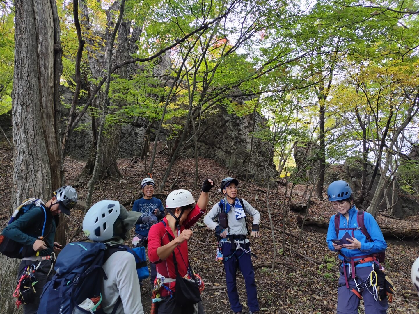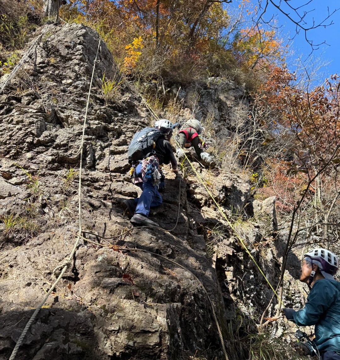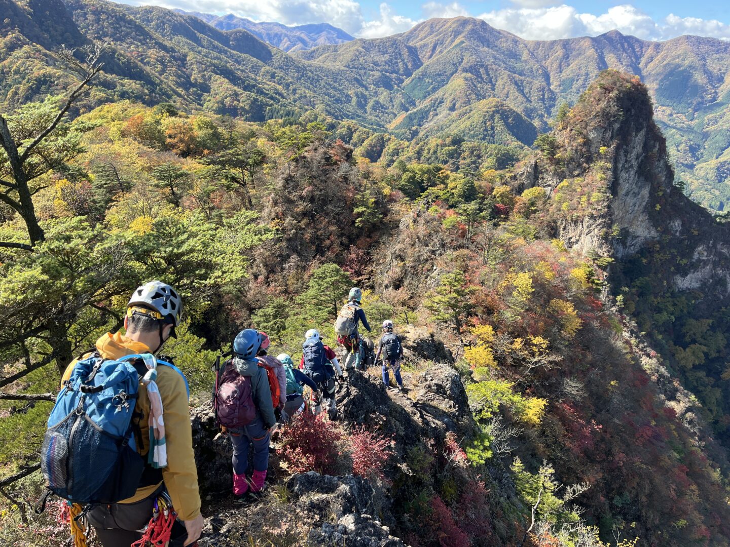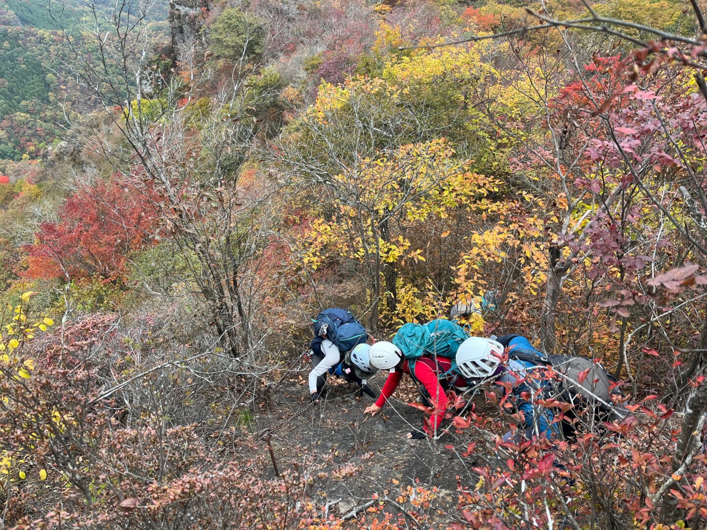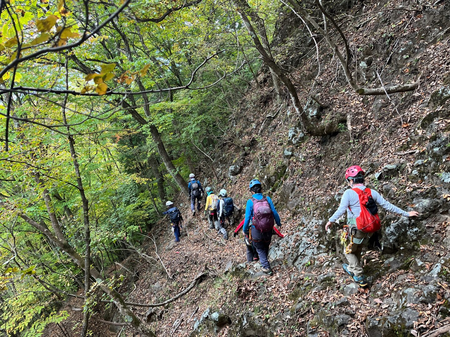 今回、プチバリ初級コース。初参加者も多く、碧岩直下の2段20m岩登り箇所での2回のロープ出しや懸垂下降などで想定以上の時間を要したが、快晴の中、秋の西上州とプチバリ山行を存分に楽しめたのではないだろうか。