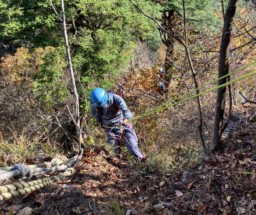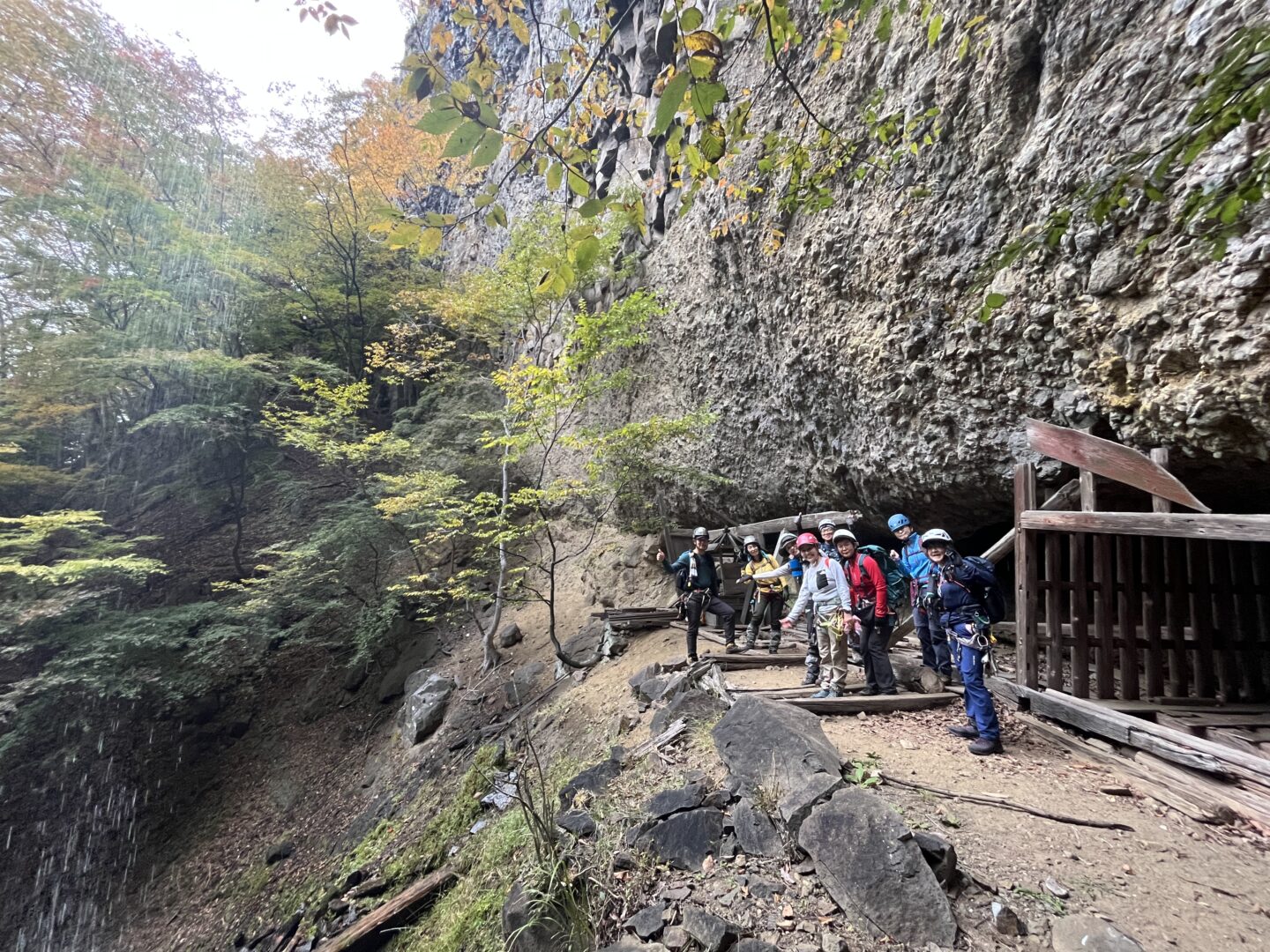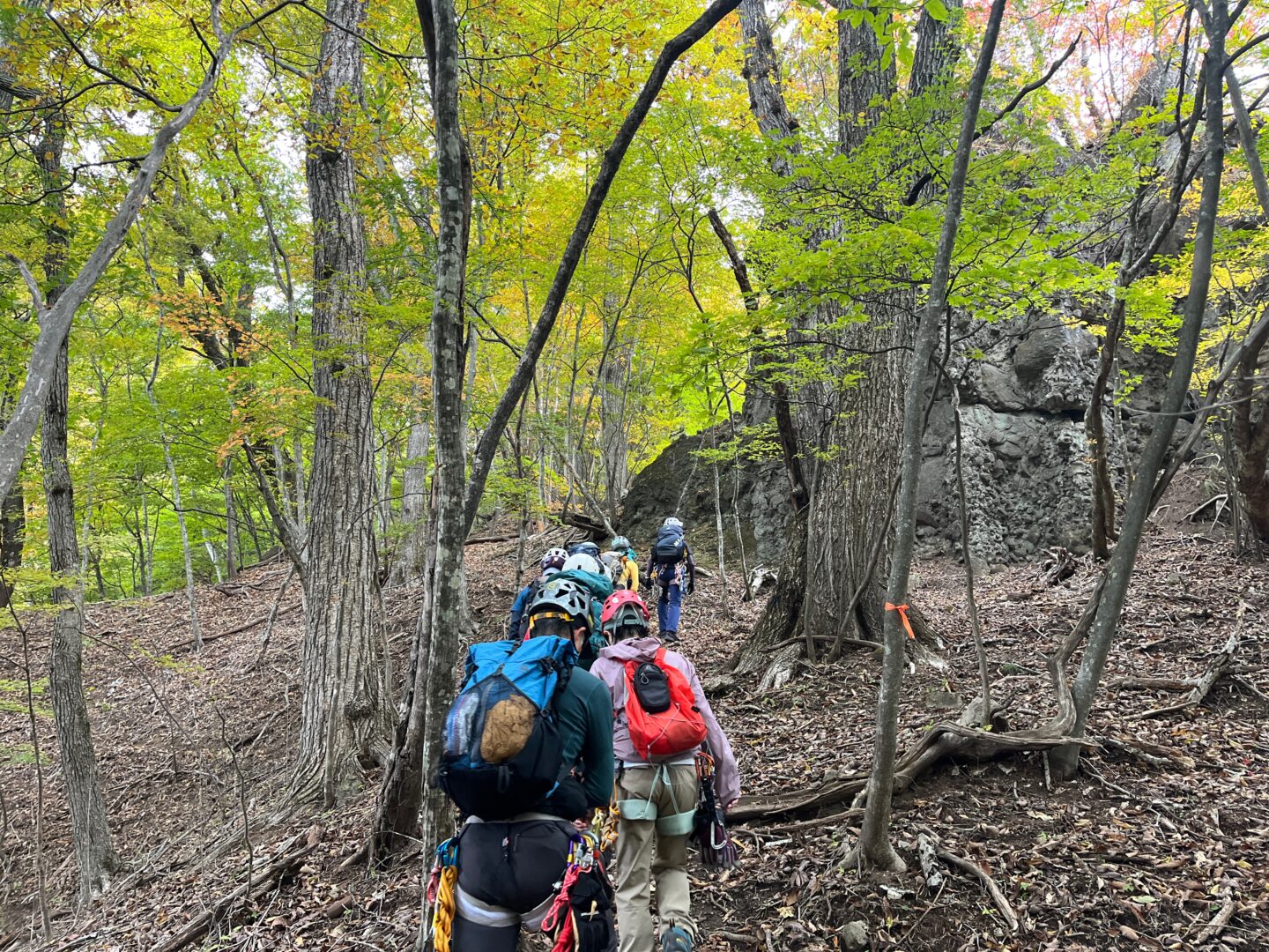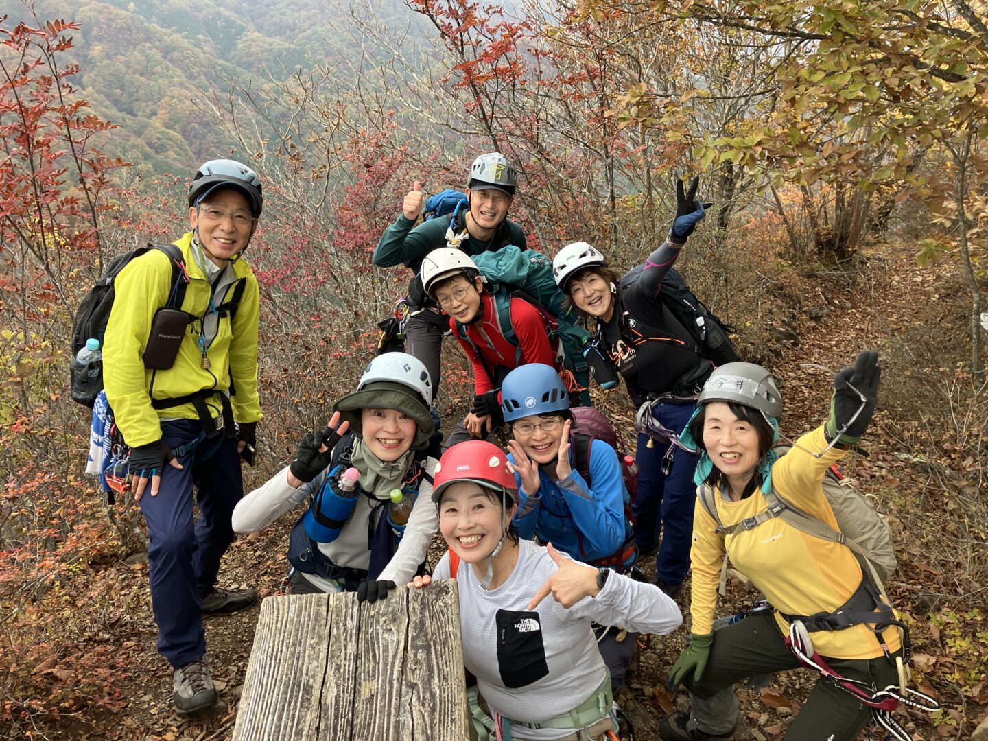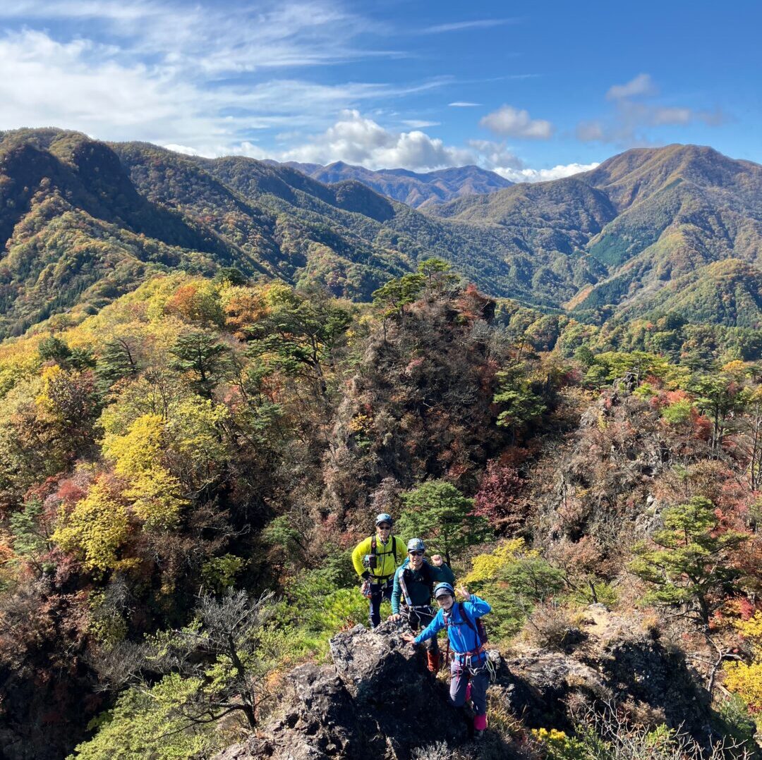 今回、プチバリ初級コース。初参加者も多く、碧岩直下の2段20m岩登り箇所での2回のロープ出しや懸垂下降などで想定以上の時間を要したが、快晴の中、秋の西上州とプチバリ山行を存分に楽しめたのではないだろうか。