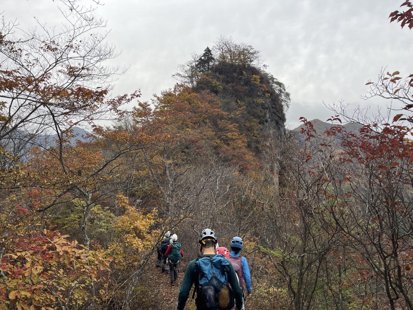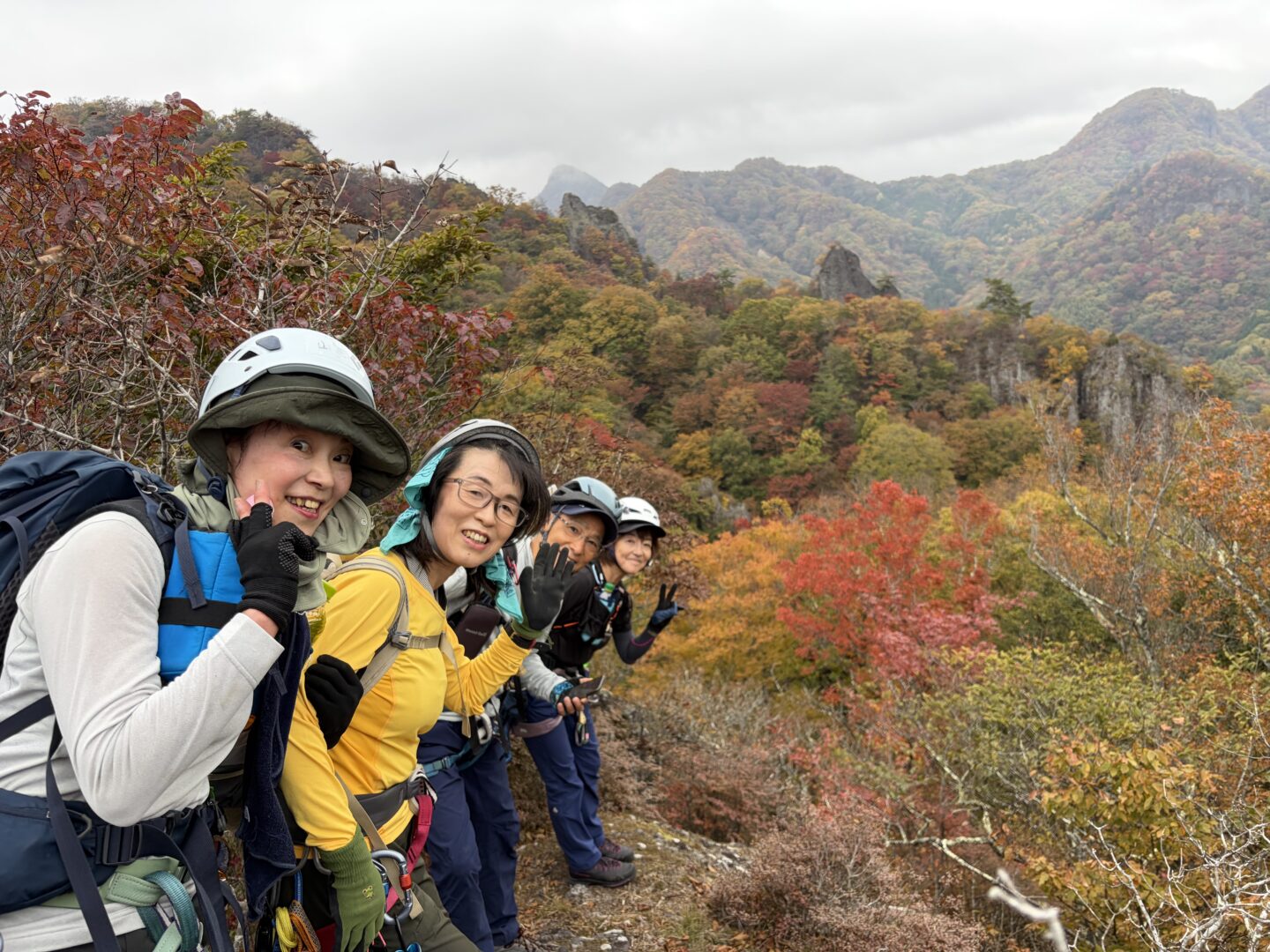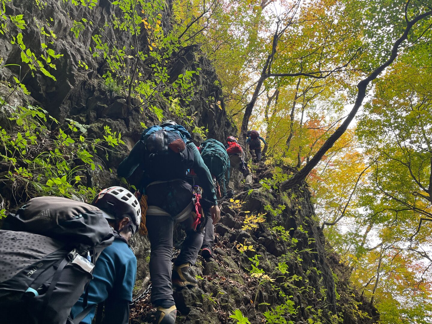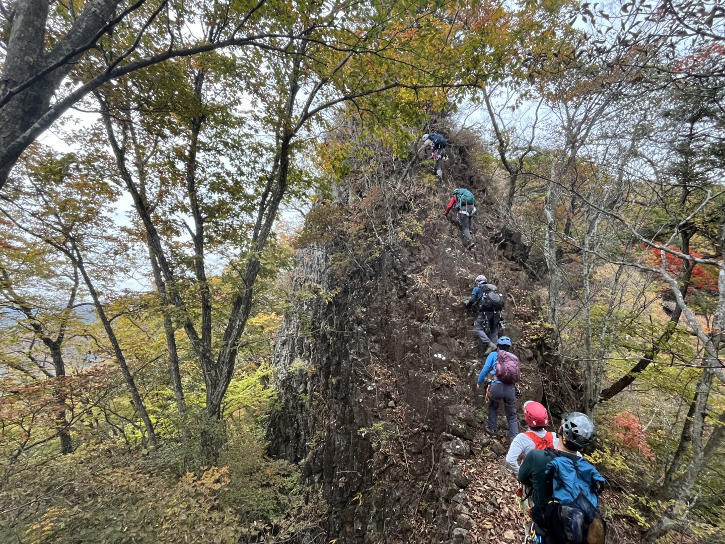 三段の滝までは、何度も渡渉し、朽ちかけた橋を渡る沢沿いの道を進む。足元は常に滑る恐怖と隣り合わせで、「怖い、怖い」と心の中でつぶやきながら、慎重に歩みを進めた。三段の滝からは大岩への急登が始まり、正直、身体にこたえる登りが続く。しかし、稜線が開けると、そこには息をのむような紅葉の素晴らしい世界が広がっていた。真っ赤、黄色、オレンジ…。自然が織りなす圧倒的な美しさに、身体中の疲れは嘘のように吹き飛んだ。ここからは気が抜けない岩稜歩きが続く。大岩で早めのランチを済ませ、いざ核心の碧岩へ。