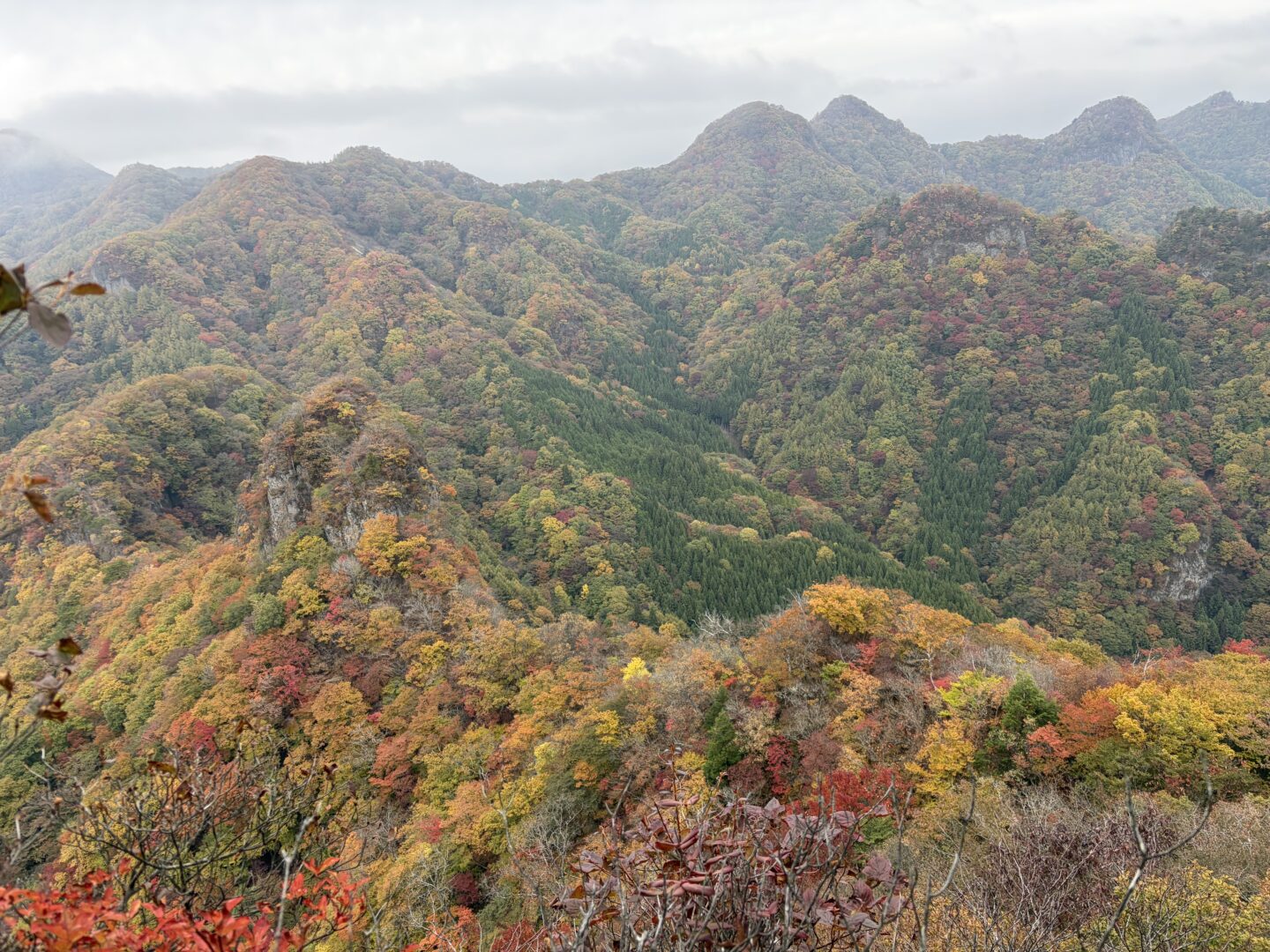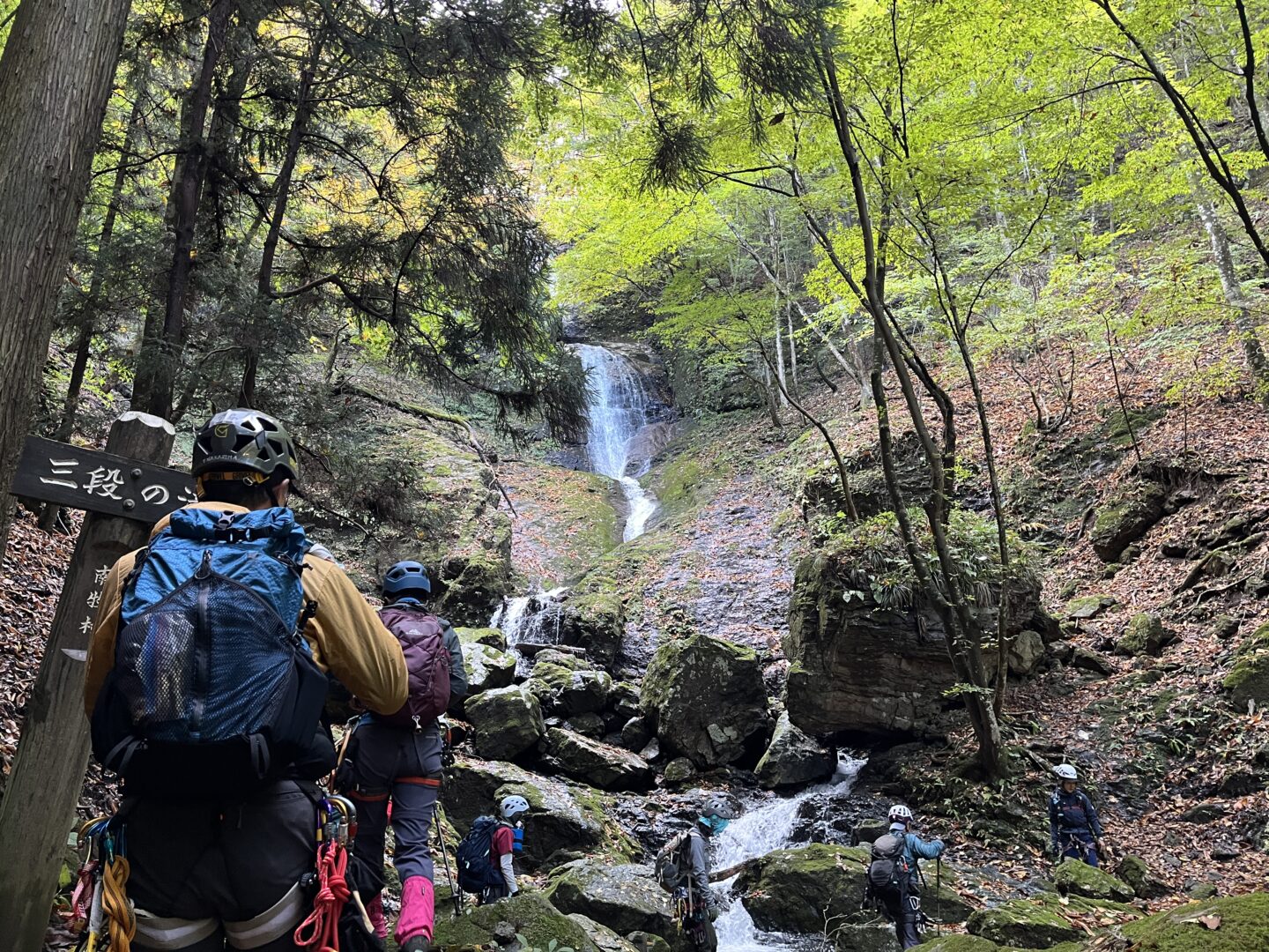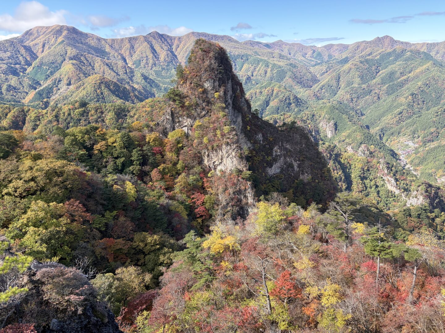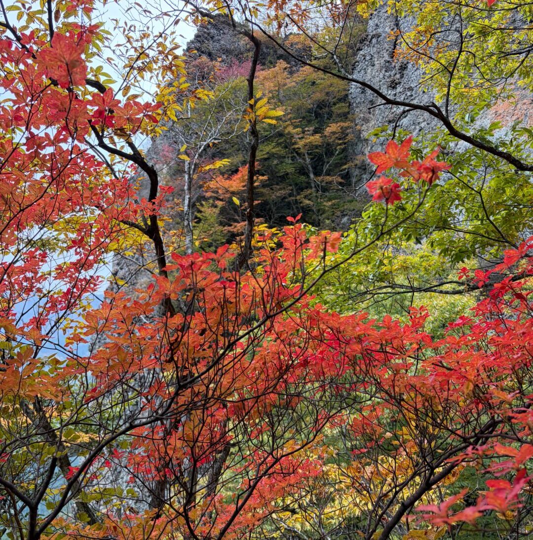 三段の滝までは、何度も渡渉し、朽ちかけた橋を渡る沢沿いの道を進む。足元は常に滑る恐怖と隣り合わせで、「怖い、怖い」と心の中でつぶやきながら、慎重に歩みを進めた。三段の滝からは大岩への急登が始まり、正直、身体にこたえる登りが続く。しかし、稜線が開けると、そこには息をのむような紅葉の素晴らしい世界が広がっていた。真っ赤、黄色、オレンジ…。自然が織りなす圧倒的な美しさに、身体中の疲れは嘘のように吹き飛んだ。ここからは気が抜けない岩稜歩きが続く。大岩で早めのランチを済ませ、いざ核心の碧岩へ。