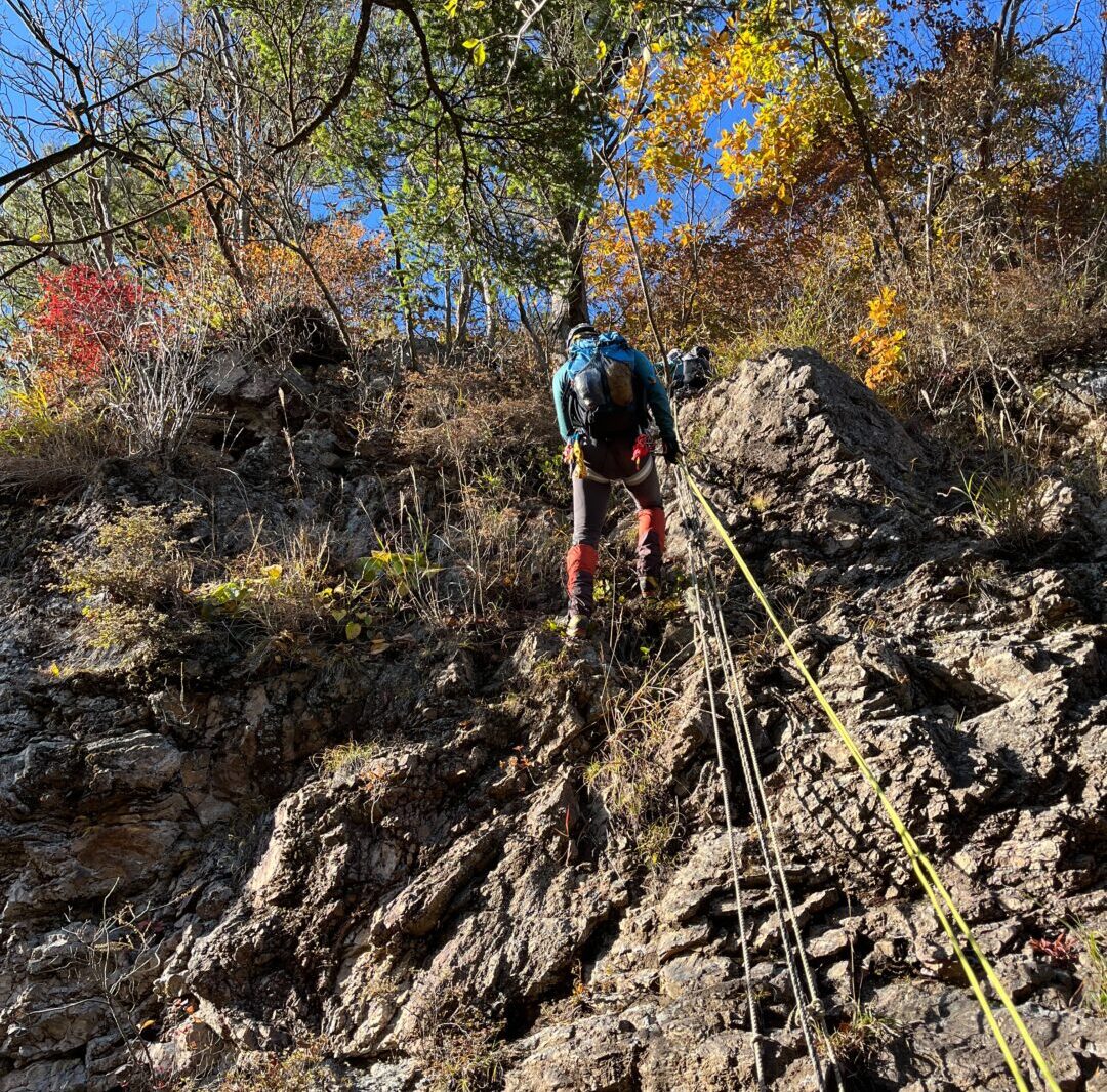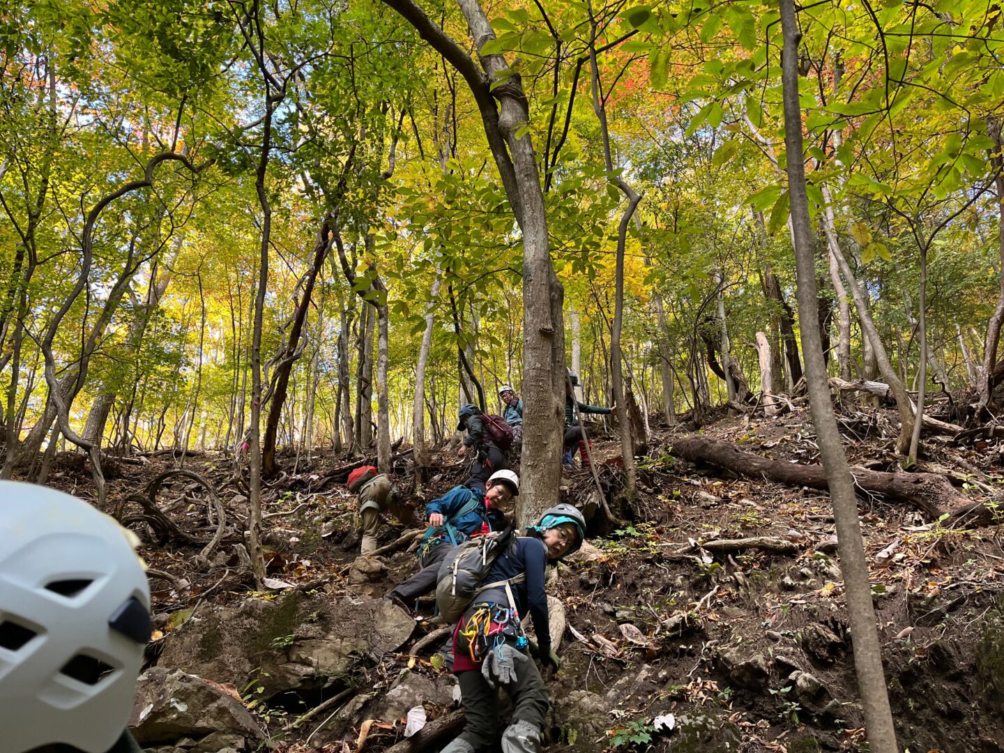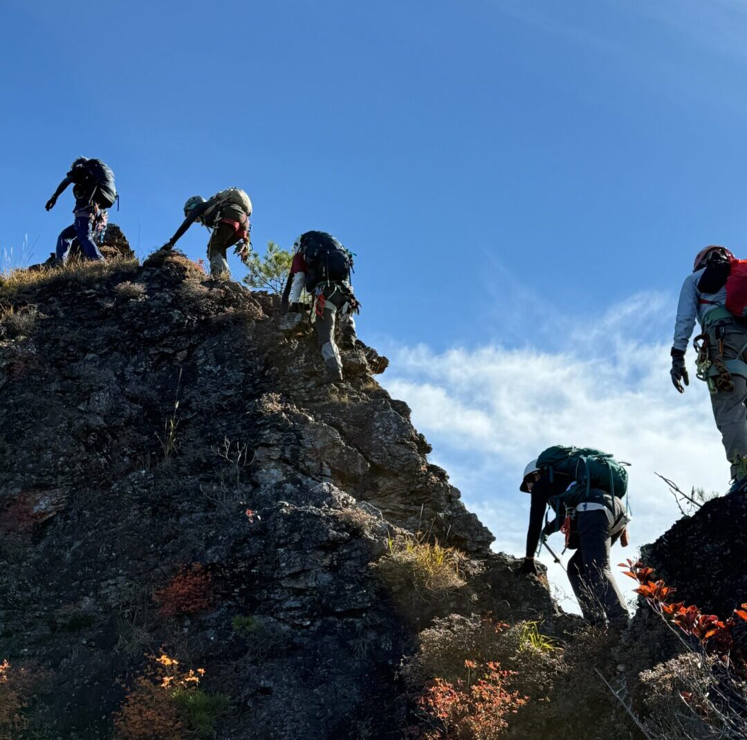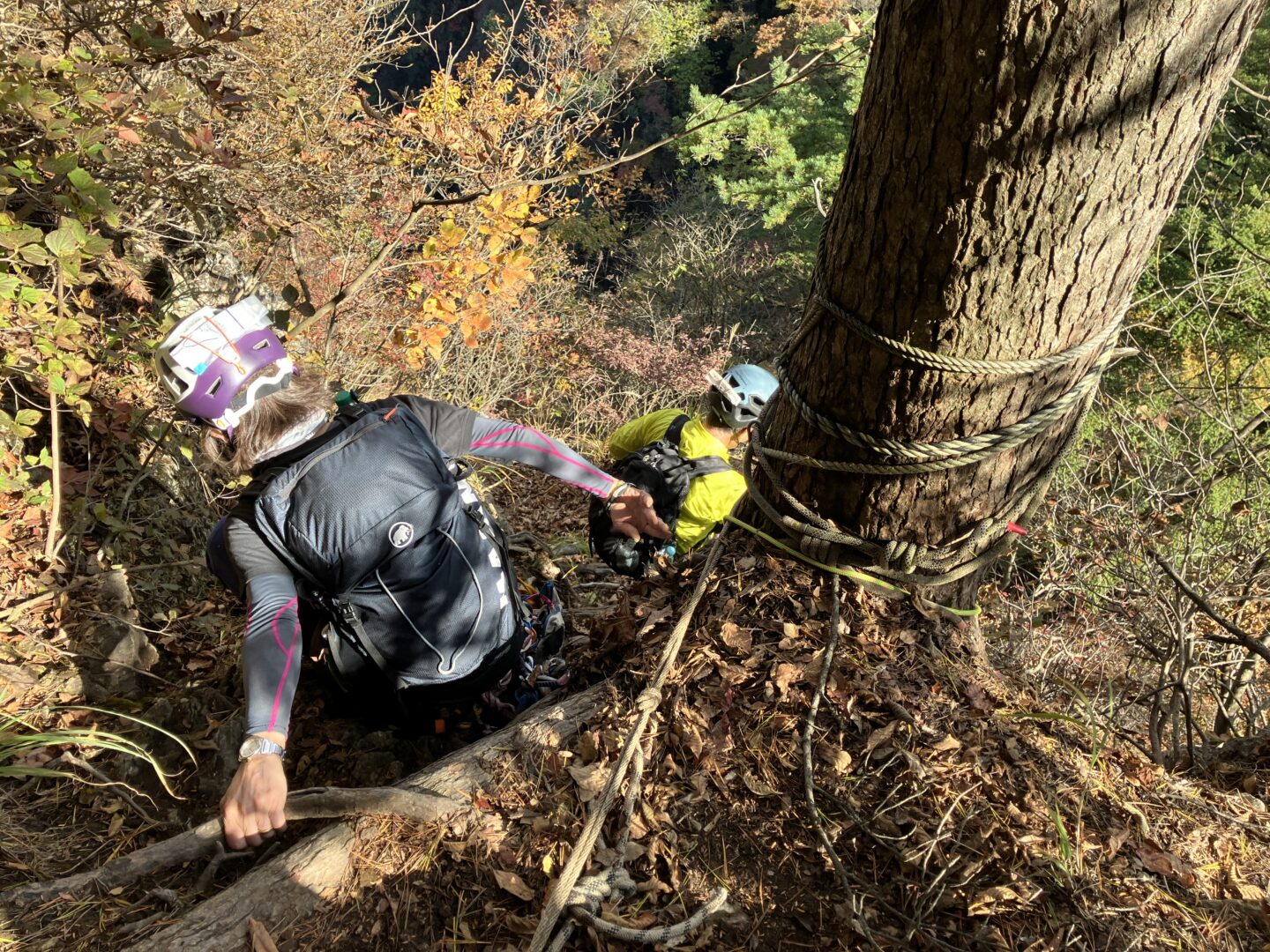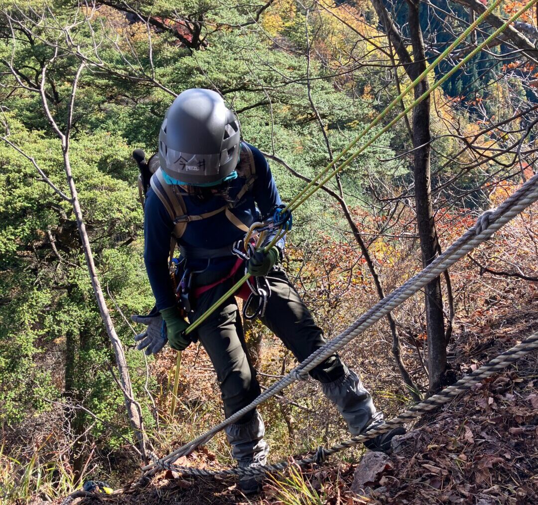 しかし、なんとか無事マッターホルン(碧岩)に登頂! 達成感もつかの間、帰りは懸垂下降だ。「どうやるんだっけ?」…。半年前の講習を懸命に思い出そうとするが、肝心な手順が出てこない。この時点で完全にアウトだ。家で練習しておくべきだったという後悔が押し寄せ、焦りが募る。初めての実地での懸垂下降は、技術不足を痛感する大きな反省を残すものとなった。その後の下山道も、急登かつ落ち葉で非常に滑りやすい状況。ここでチェーンスパイクを装着。そのグリップ力に助けられ、安心して下山することができた。