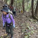 甲府駅に8時30分に集合した14名で、タクシーに分乗。登山口のフェンスを開いていざ!朝の雨がうそのように青空が広がる。登山道はふっかふかで心地良い。静かな森林帯に突然現れた奇岩は、歌川広重が描いたと言われ、歴史を感じる。広い森林は美しく、ロマンチックだ。落ち葉に赤や黄色も混じり、自然と歩みが進む。「写真撮りたかったら止まるので言ってねぇ」と、天使の声に笑みがこぼれる。