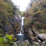 ロープウェイで下山して、駐車場までプチ観光。見上げれば青空、天狗岩や覚円峰などの美しい渓谷、鮮やかな紅葉と水量豊富な仙娥滝。