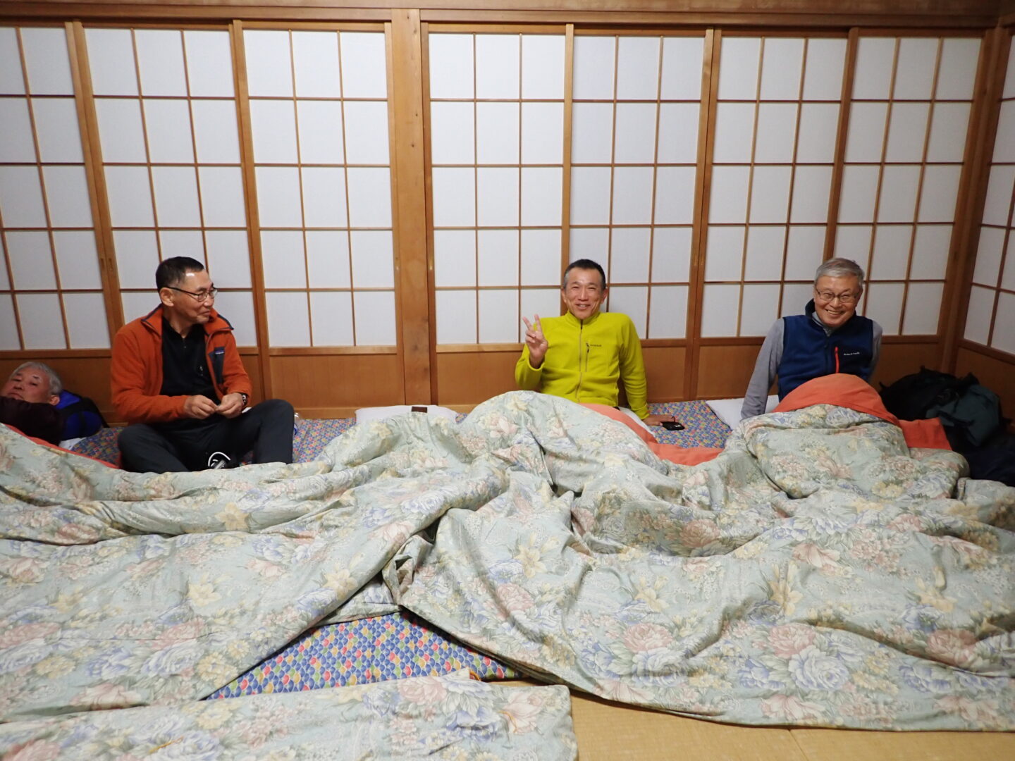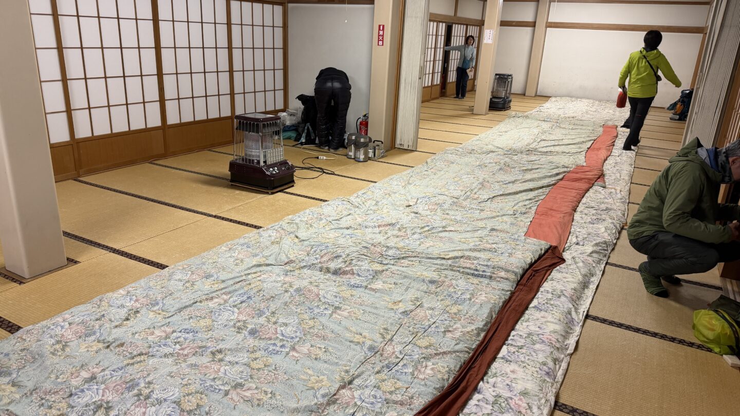 21時になり、初体験の巻き布団(1枚が長ーい布団で、4〜5人で寝ます)で就寝となり、1日目を終えました。(文責:4000)