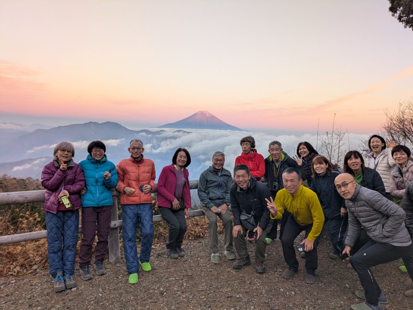 空が徐々に白み始めると霊峰・富士山が眼前に浮かび上がり、暫くするとオレンジ色の光が空と雲海を染め上げ、あたり一面を神々しい光で満たしていく。その荘厳な光景に山行の安全を祈った。