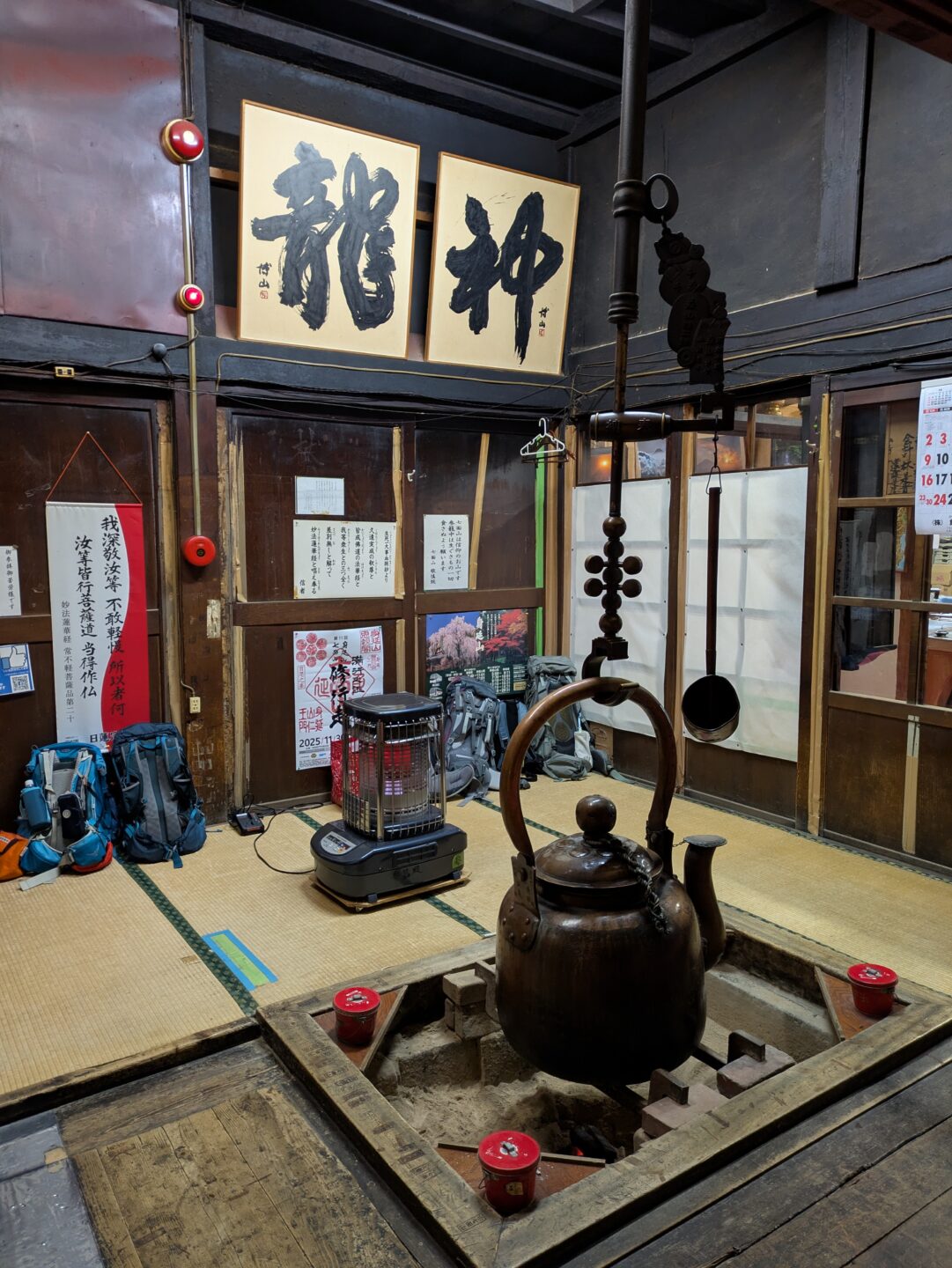 法華経の聖地として名高い七面山は、祈りの道とのこと。参道には一丁目から五十丁目まで目印になる石灯篭が立っていて、広い休憩所も多く、多くの方が参拝に登られるのが伺えました。四十六丁目の和光門をくぐり、登って行くと鐘楼。手水舎で、全員が手、口を清め敬慎院をめざします。山行経験豊富な参加者が多かったので、予定より早く到着。宿坊ということで寒いと想像していたが、部屋は暖かく、綺麗で快適でした。