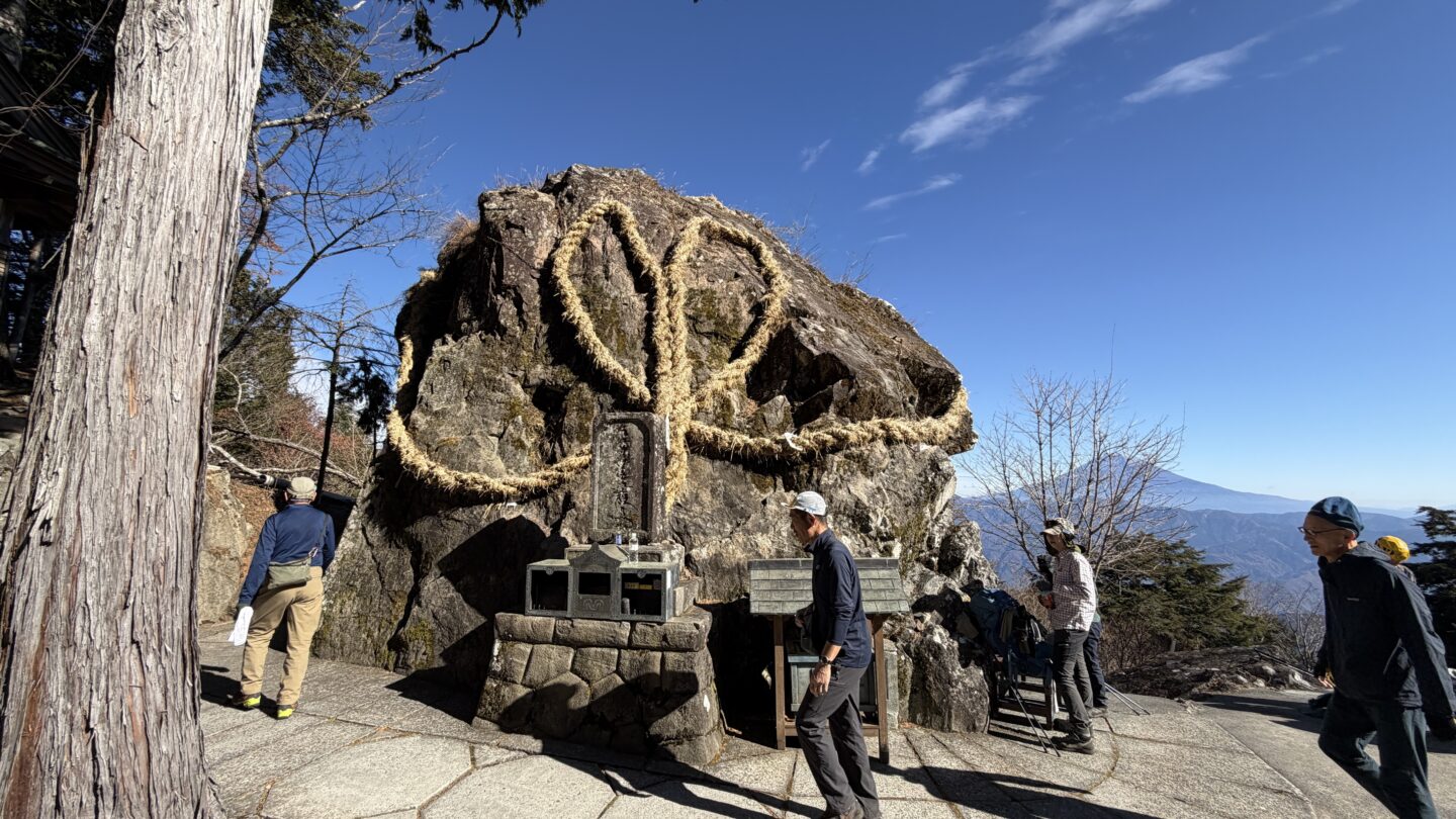 朝食を済ませ身支度を整えて、いよいよ山頂に向け全員で出発。敬慎院から小1時間ほど歩くと、山頂(三角点設置点)に到着する。