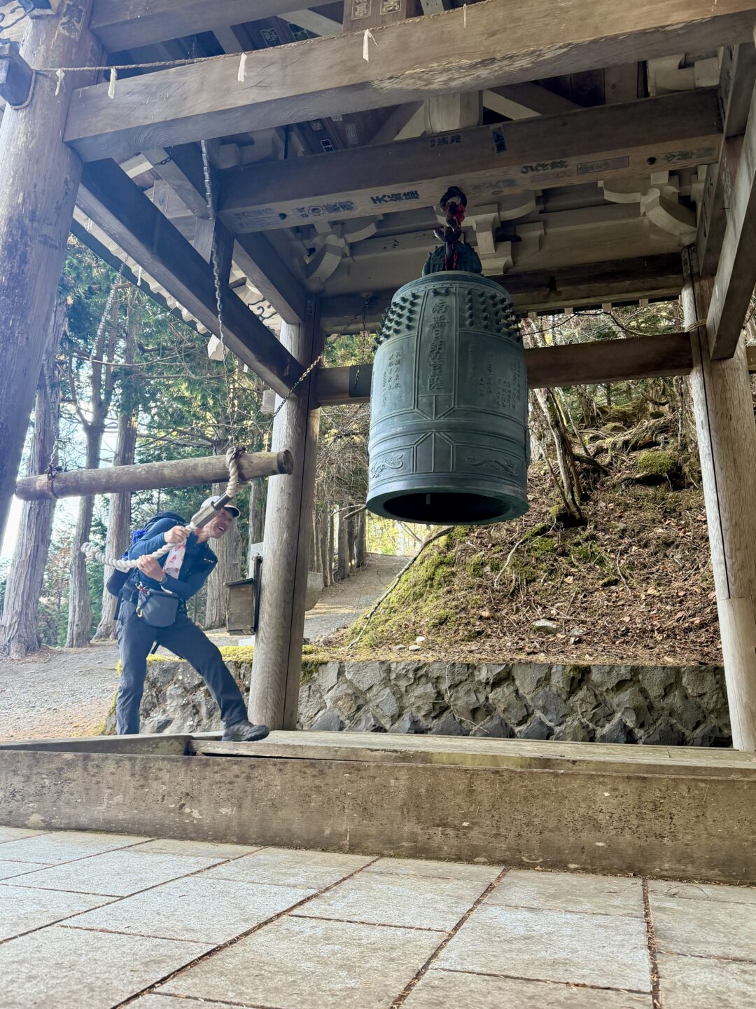 - 唱題しながら7度回るとご利益があると言われる影嚮石。短い休憩時間内で急いでぐるぐる