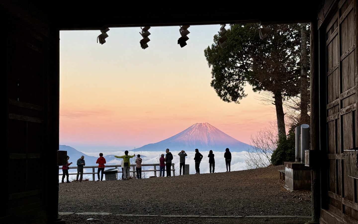 夕方、日の入りを見に随身門へ。薄い桜色に見える富士山は、思わず歓声をあげてしまうほど美しく、感動と感謝の気持ちが込み上げてきました。