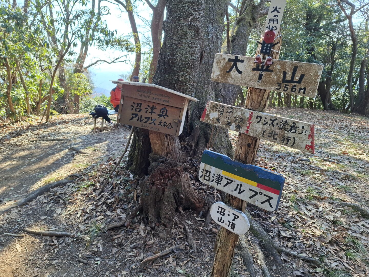 1月24日、沼津駅に集合した15名で路線バスに乗車し、多比バス停で下車する。海岸近くにあってか、帽子が飛ばされるほどの風が吹く中、最初の目的地、大平山に向けて出発する。登山口へ続く分岐から急な登りが始まる。息が切れる。