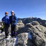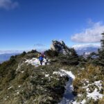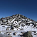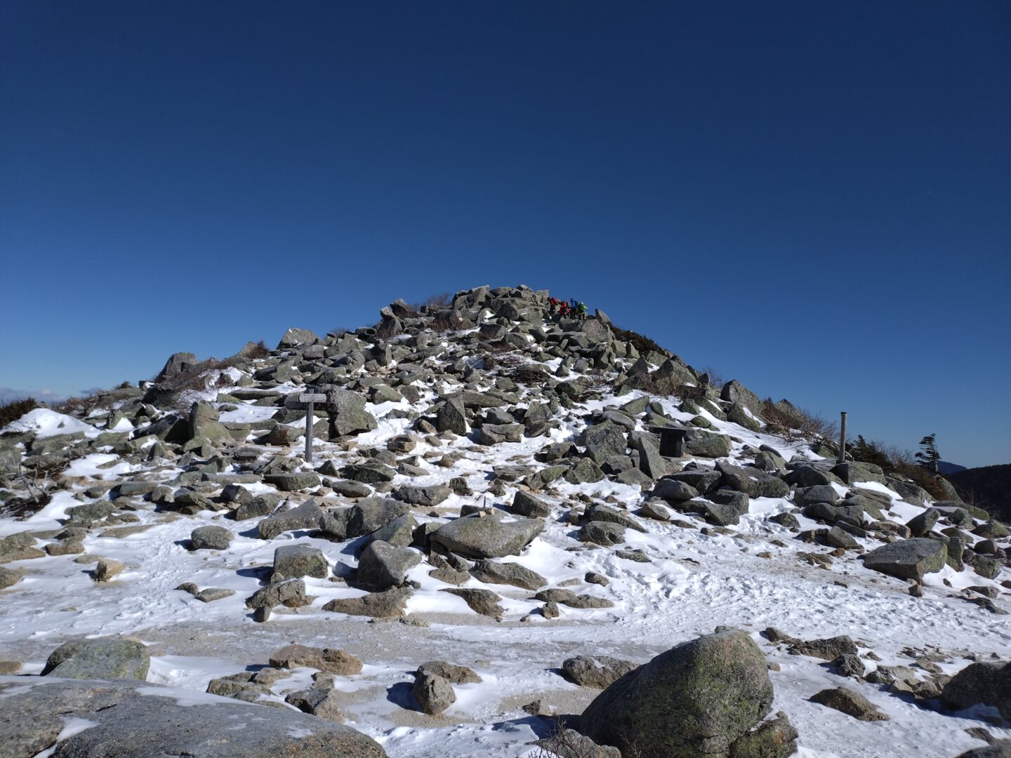 - 雪と岩がミックスした山頂は、危険で長居できない