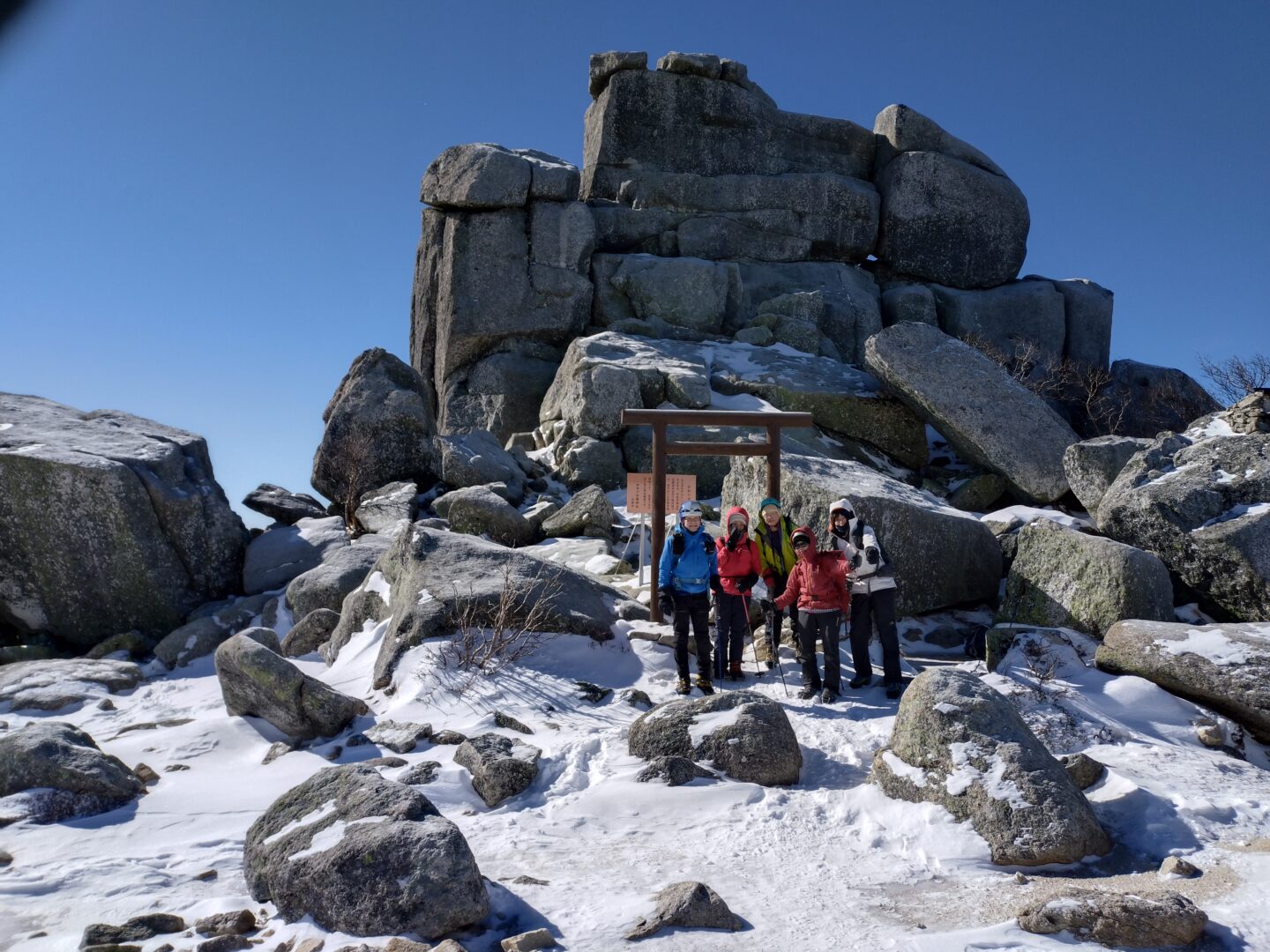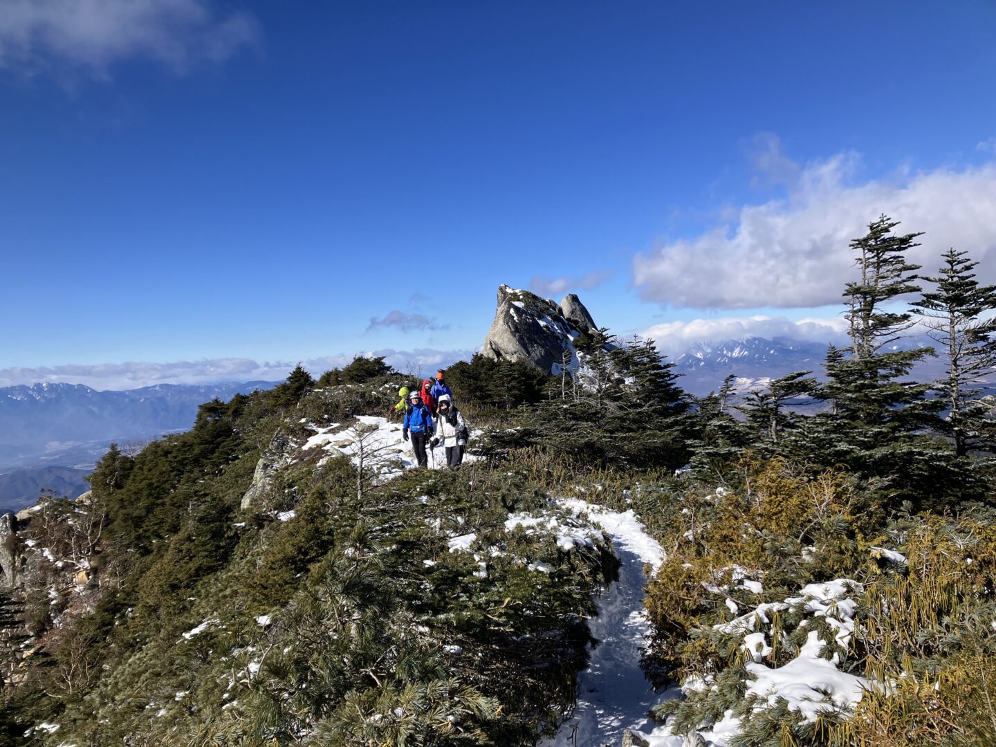 五丈岩を過ぎ、遂に金峰山の頂点に立った。真っ青な空と明るい日差し、360度の美しい山々。周囲は一面の雪山世界だ。それまでの土と岩を歩くしかなかった恨めしさが吹き飛び、来てよかったと思う。「登頂したぞ!」と心の中で確認し、五丈岩まで戻って、風を避けながら昼食。その後、下山を開始した。