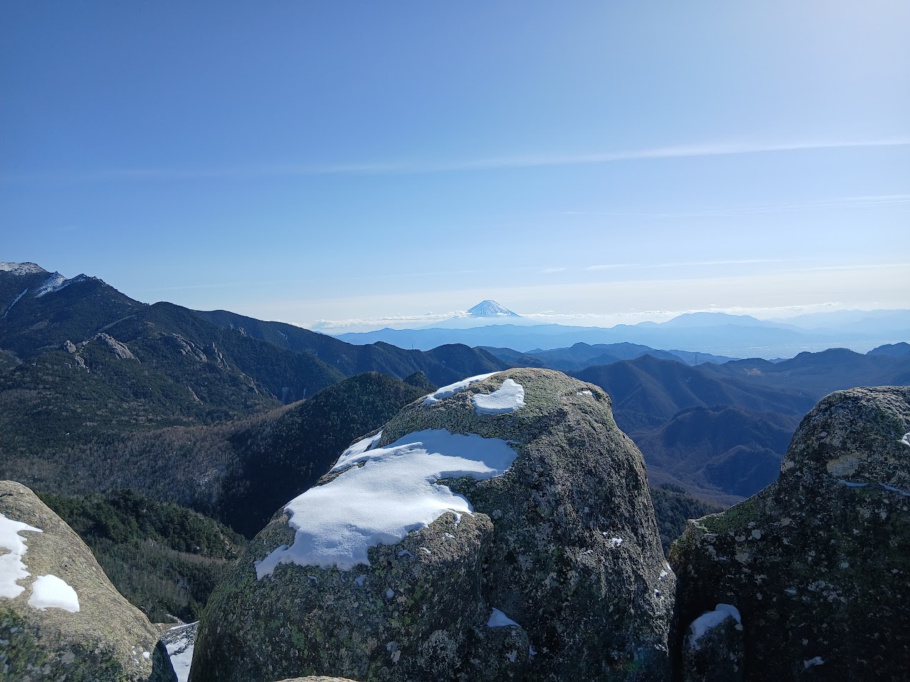 - 瑞牆山山頂からの富士山。仲間が雪山教室で頑張ってるかな