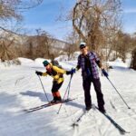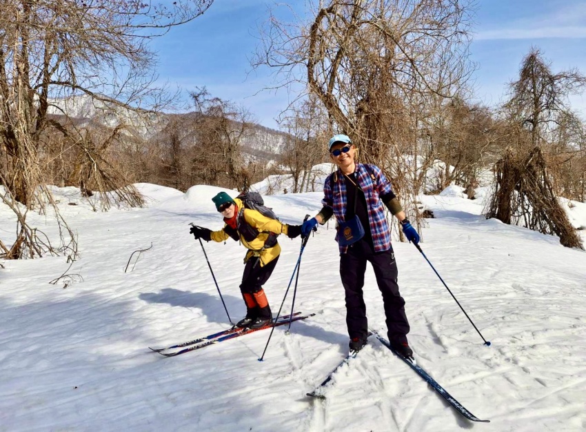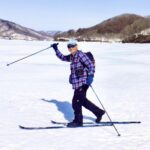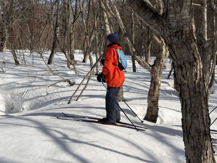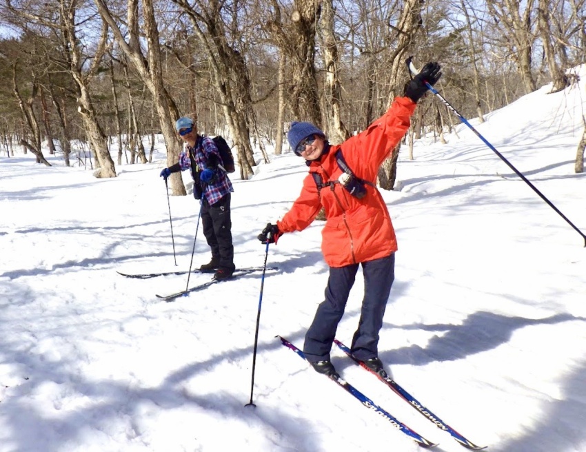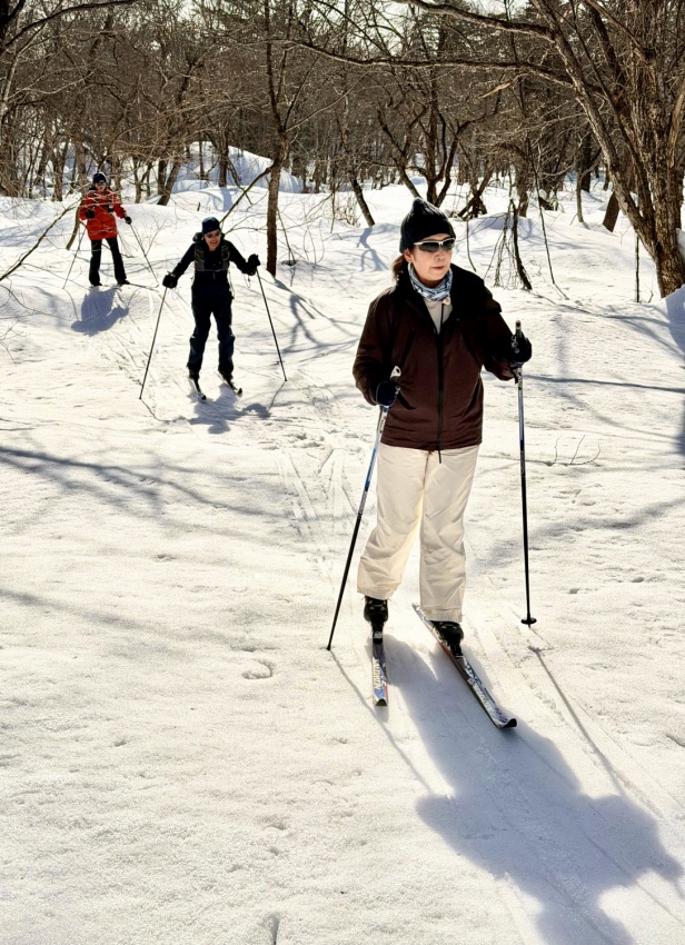 いよいよクロスカントリースキーに初挑戦。今回はガイド付きで、板の履き方から取り回しまでレッスンを受け、いざコースへ。板は細くエッジがないので苦戦するも、気温は高く、汗(冷や汗)をかきながら必死にコースを一周するころには何とか雪の上を歩く感じをつかみ、初日のレッスンを終えた。
