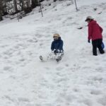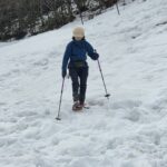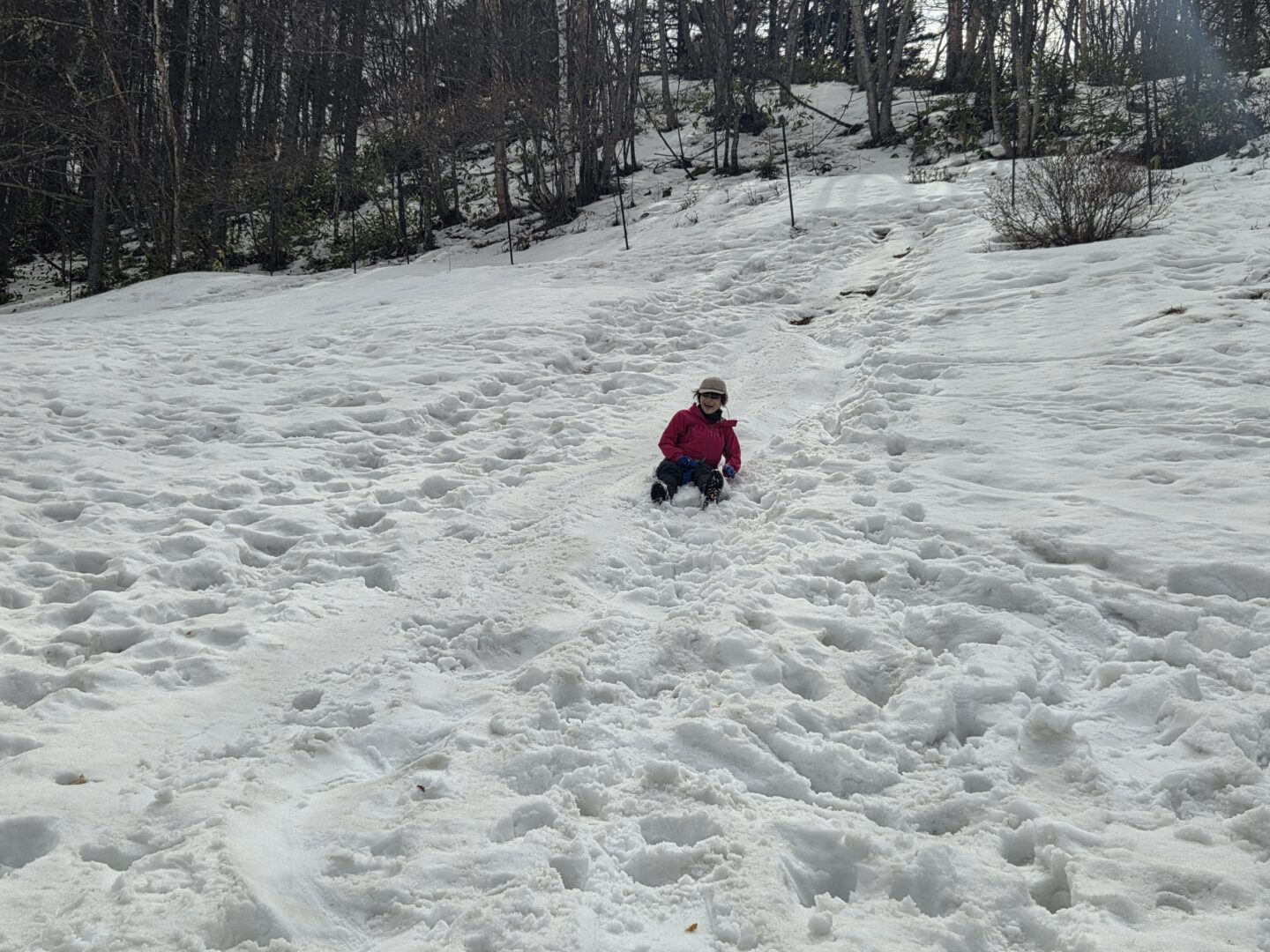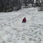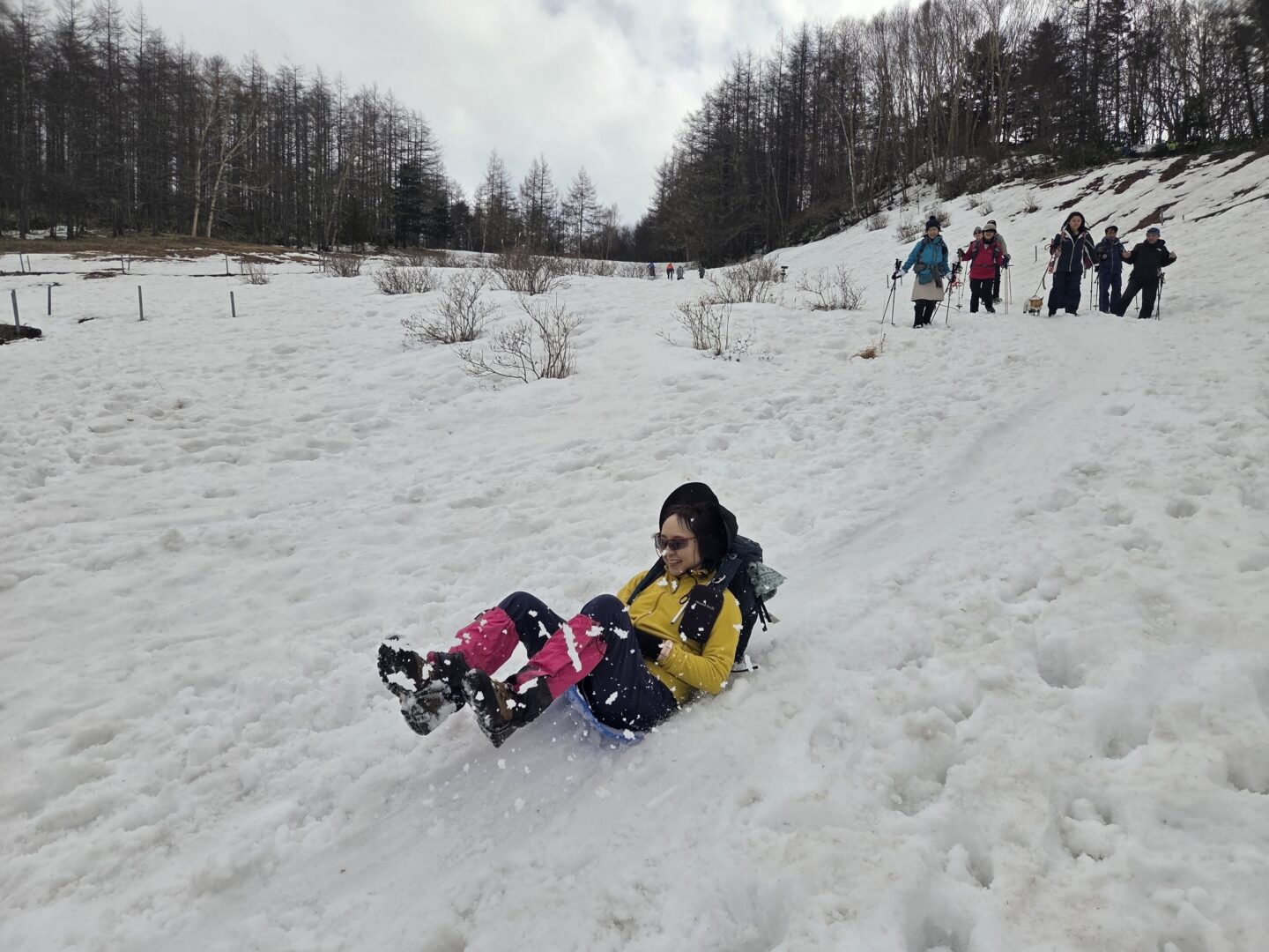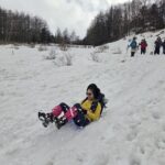 下りも軽アイゼンでサクサク歩く。お花畑で「ちょっと遊んでゆきましょう!」。麓で1台だけレンタルしたスノーシューを体験していただく。が、どちらかと言うと、自宅から持ってきたヒップそりが人気。初めはおそるおそる滑るが、すぐにうまく滑れるようになった。