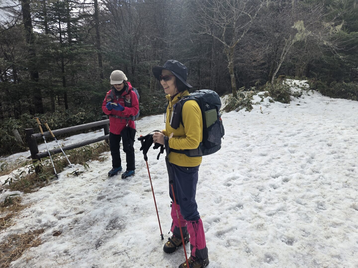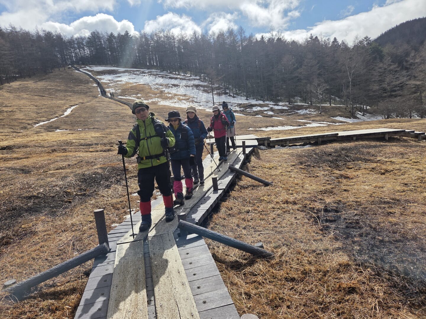 - 雪山装備で乾いた木道を歩く